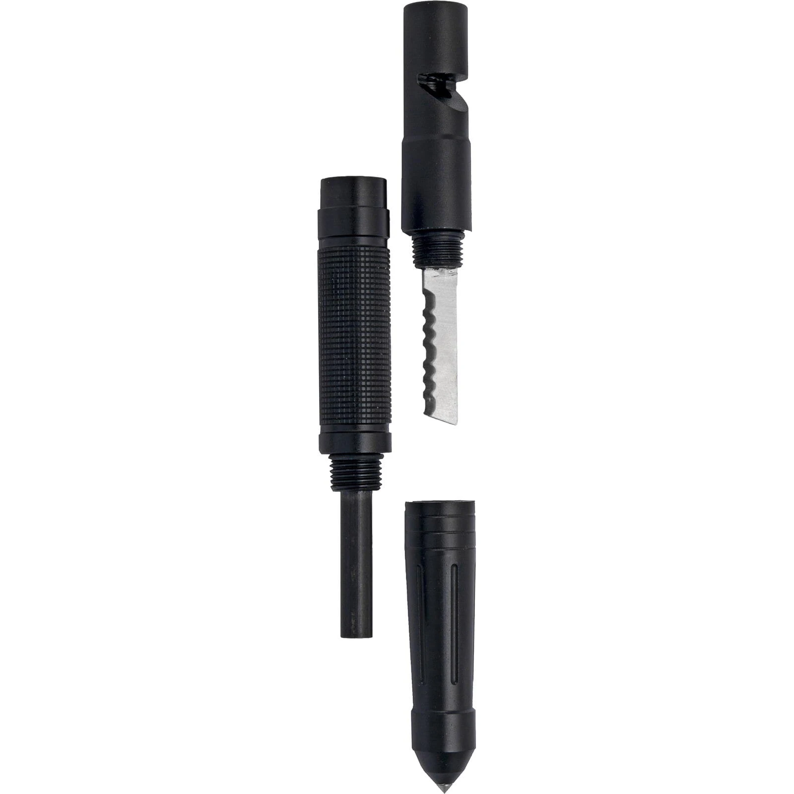 Dieses praktische 4 in 1 Tool gehört in jede Ausrüstung. Aus hochwertigem Aluminium gefertigt und kaum größer als ein Kugelschreiber vereint das Tool vier Funktionen um sich im Notfall zu helfen: einen Nothammer für Autoglas, eine laute Notfallpfeife, einen Zündstahl sowie eine sehr scharfe Säge. Die Gewinde des Tools haben ein sehr geringes Spaltmaß sowie eine Dichtung und sorgen dafür, dass Zündstahl und Säge vor Feuchtigkeit geschützt sind.