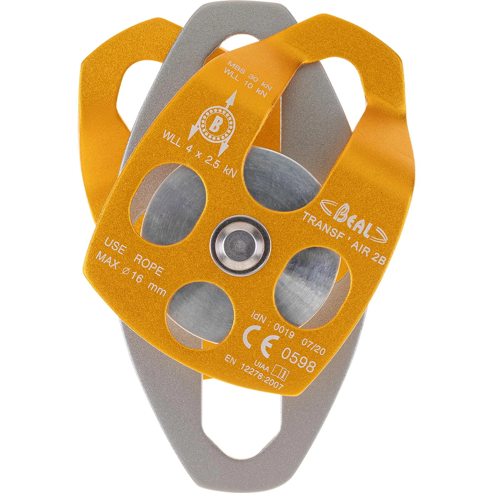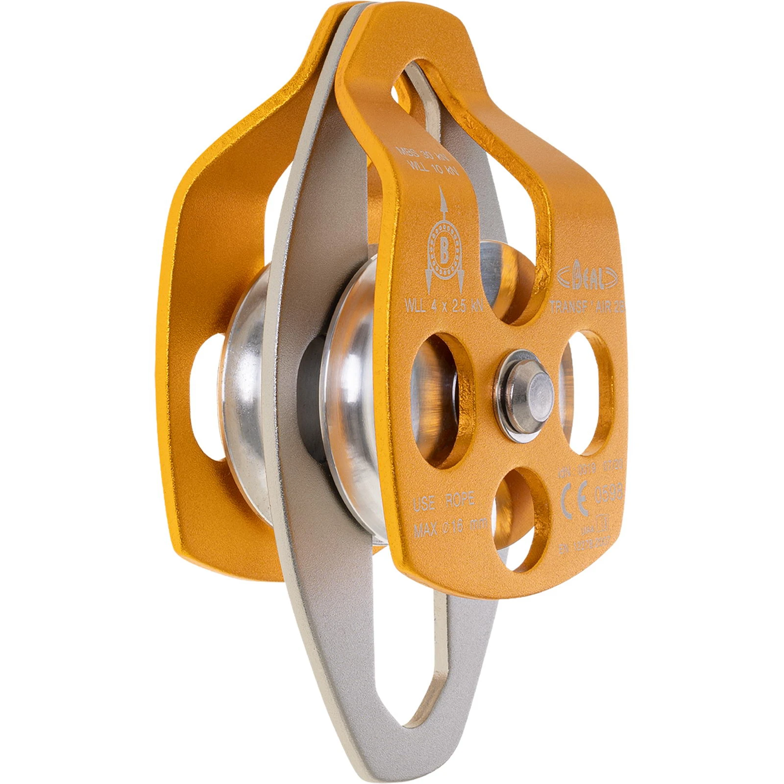 Die hocheffiziente Transf’air 2 B von Beal ist eine doppelte Seilrolle mit drehbaren Seitenplatten und Kugellager. Die große Seilrolle ist ideal für die Verwendung mit großen Seildurchmessern, z.B. für Konstruktionen von Flaschenzügen oder zum Lastenheben.