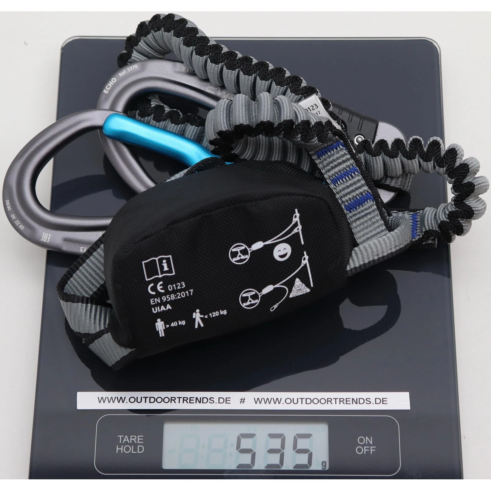 | Merkmale | Bandfalldämpfer, leicht und kompakt, Echo-Karabinern mit ergonomischem Design und einer großen Öffnung, um das Greifen und Verbinden mit den Anschlagpunkten zu erleichtern, Einbindeschlaufe aus solidem Band, für eine einwandfreie Befestigung am Gurt mittels Ankerstich, elastische Sicherungsarme mit 19 mm Schlauchband (Rewind-System) für körpernahes Handling der Karabiner, erfüllt die Sicherheitsanforderungen, vorgesehen von den Normen EN 958 und UIAA 128, inklusive Packbeutel |