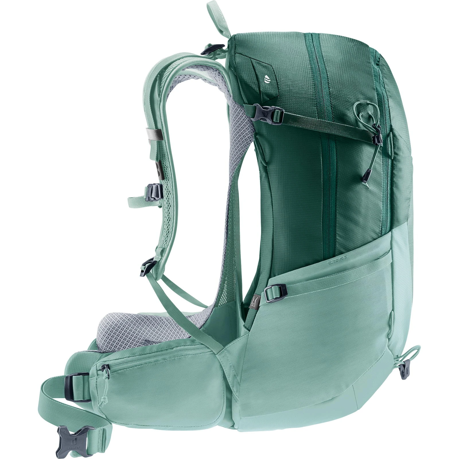 Der sportliche und funktionelle Wanderrucksack Futura 25 SL von deuter für Damen ist ideal für Tageswanderinnen, die viel Wert auf hohen Komfort bei maximaler Belüftung legen. Das deuter Aircomfort Rückensystem vereint Leichtigkeit, perfekte Passform, komfortable Bewegungsfreiheit durch Flexibilität und maximale Belüftung. Die innovative Konstruktion der Hüftflossenpartie und ihr fließender Übergang in das Rückennetz umschließen die Trägerin förmlich und sorgen für bequemen Sitz. Die flexible Rahmen-Konstruktion aus dauerhaft elastischem und bruchfestem Federstahl gibt dem Aircomfort-Rückennetz seine stabile Spannung. Zuverlässig schafft es einen Ventilationsraum zwischen Rucksack und Rücken, über den die feuchte Luft ungehindert abzieht. Die hohe Flexibilität der gesamten Konstruktion gibt der Trägerin Bewegungsfreiheit. Bewegliche Active-Fit Schulterträger sitzen komfortabel durch ihre automatische Anpassung an Breite und Winkel der Schulterpartie. Ihre ergonomische S-Form folgt exakt den Konturen von Schultern und Nacken – nichts drückt oder scheuert. Ihr leichter, perforierter Schaum sorgt für Belüftung. Der Rucksack wird stabilisiert und die Schultern entlastet durch Straffen der Lageverstellriemen. Leicht tragen lässt sich etwas mehr Gewicht durch kompakte, ergonomische Hüftflossen mit Pull-Forward-Verstellung beim deuter Futura 25 SL. Diese umschließen durch nah zusammenliegende Ansatzpunkte lückenlos die Hüften und ihr perforierter Schaum sorgt für Belüftung.