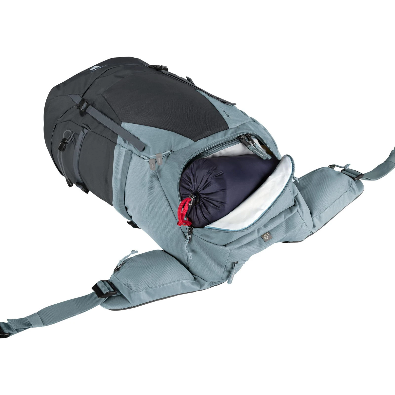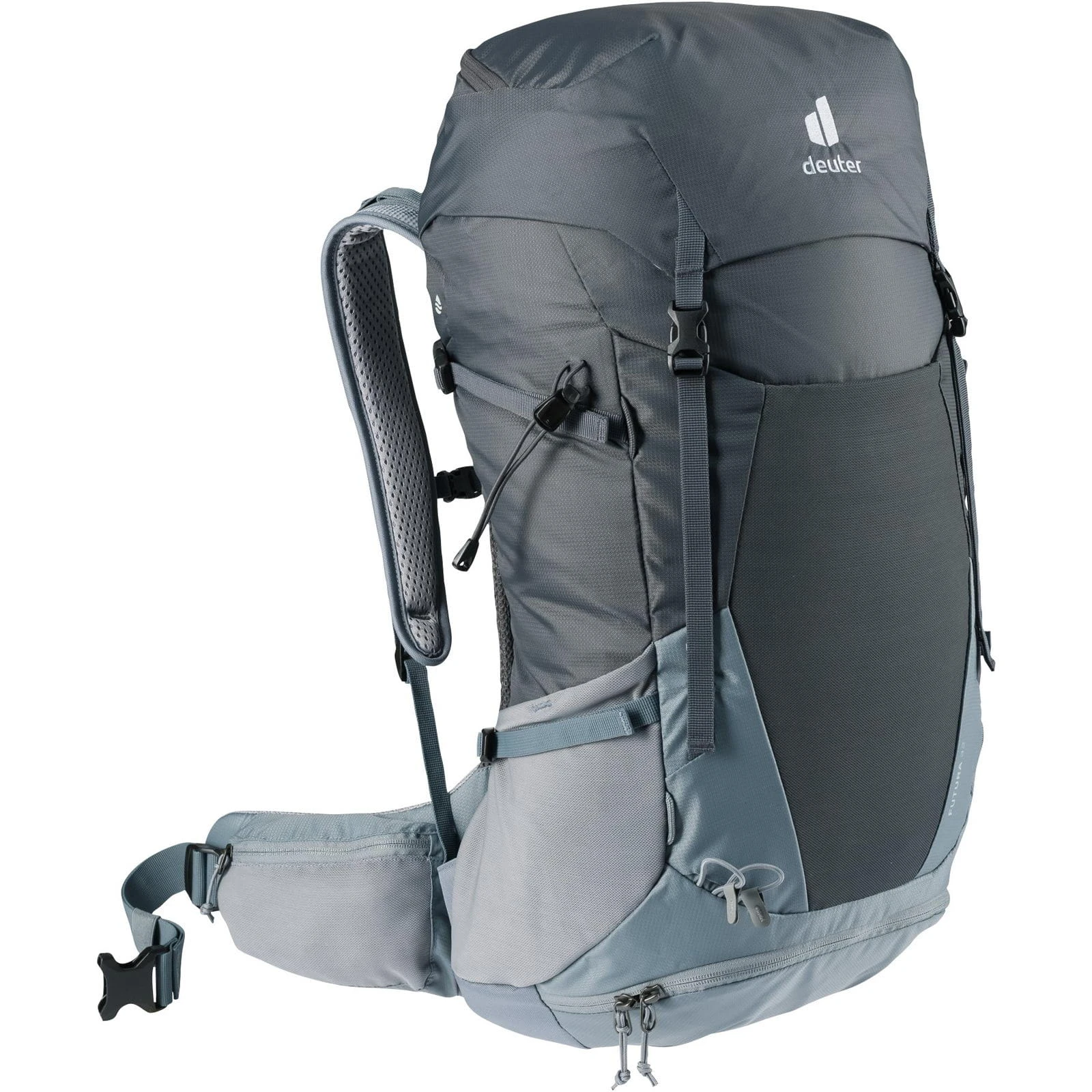 Der sportliche und funktionelle Wanderrucksack Futura 32 von deuter für Herren ist ideal für engagierte Tages- und Mehrtageswanderer, die viel Wert auf maximalen Komfort bei maximaler Belüftung legen. Das deuter Aircomfort Rückensystem vereint Leichtigkeit, perfekte Passform, komfortable Bewegungsfreiheit durch Flexibilität und maximale Belüftung. Die innovative Konstruktion der Hüftflossenpartie und ihr fließender Übergang in das Rückennetz umschließen den Träger förmlich und sorgen für bequemen Sitz. Die flexible Rahmen-Konstruktion aus dauerhaft elastischem und bruchfestem Federstahl gibt dem Aircomfort-Rückennetz seine stabile Spannung. Zuverlässig schafft es einen Ventilationsraum zwischen Rucksack und Rücken, über den die feuchte Luft ungehindert abzieht. Die hohe Flexibilität der gesamten Konstruktion gibt dem Träger Bewegungsfreiheit. Bewegliche Active-Fit Schulterträger sitzen komfortabel durch ihre automatische Anpassung an Breite und Winkel der Schulterpartie. Ihre ergonomische S-Form folgt exakt den Konturen von Schultern und Nacken – nichts drückt oder scheuert. Ihr leichter, perforierter Schaum sorgt für Belüftung. Der Rucksack wird stabilisiert und die Schultern entlastet durch Straffen der Lageverstellriemen. Leicht tragen lässt sich etwas mehr Gewicht durch kompakte, ergonomische Hüftflossen mit Pull-Forward-Verstellung beim deuter Futura 32. Diese umschließen durch nah zusammenliegende Ansatzpunkte lückenlos die Hüften und ihr perforierter Schaum sorgt für Belüftung. Für eine bessere Organisation ist der Futura 32 mit einem separaten Bodenfach ausgestattet.