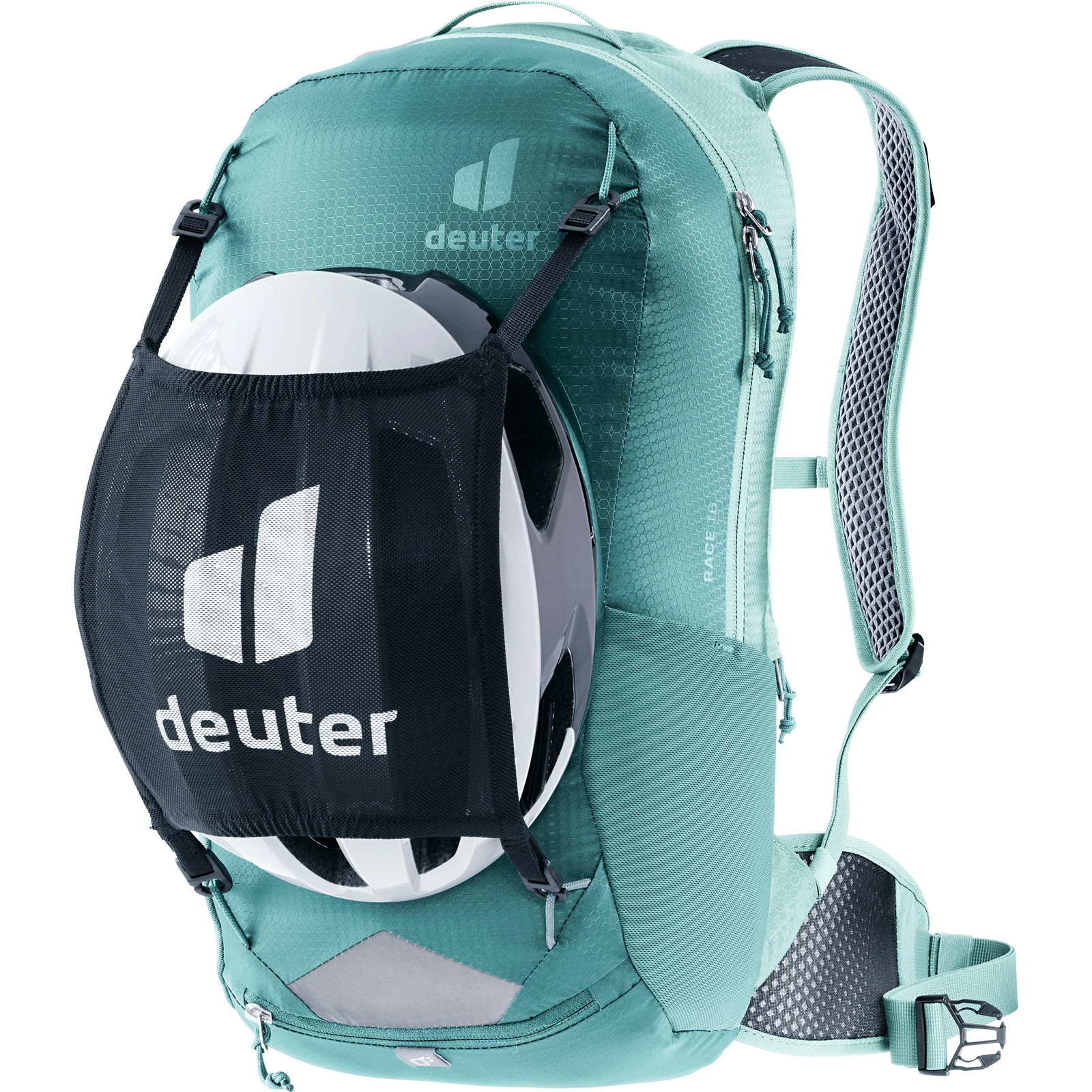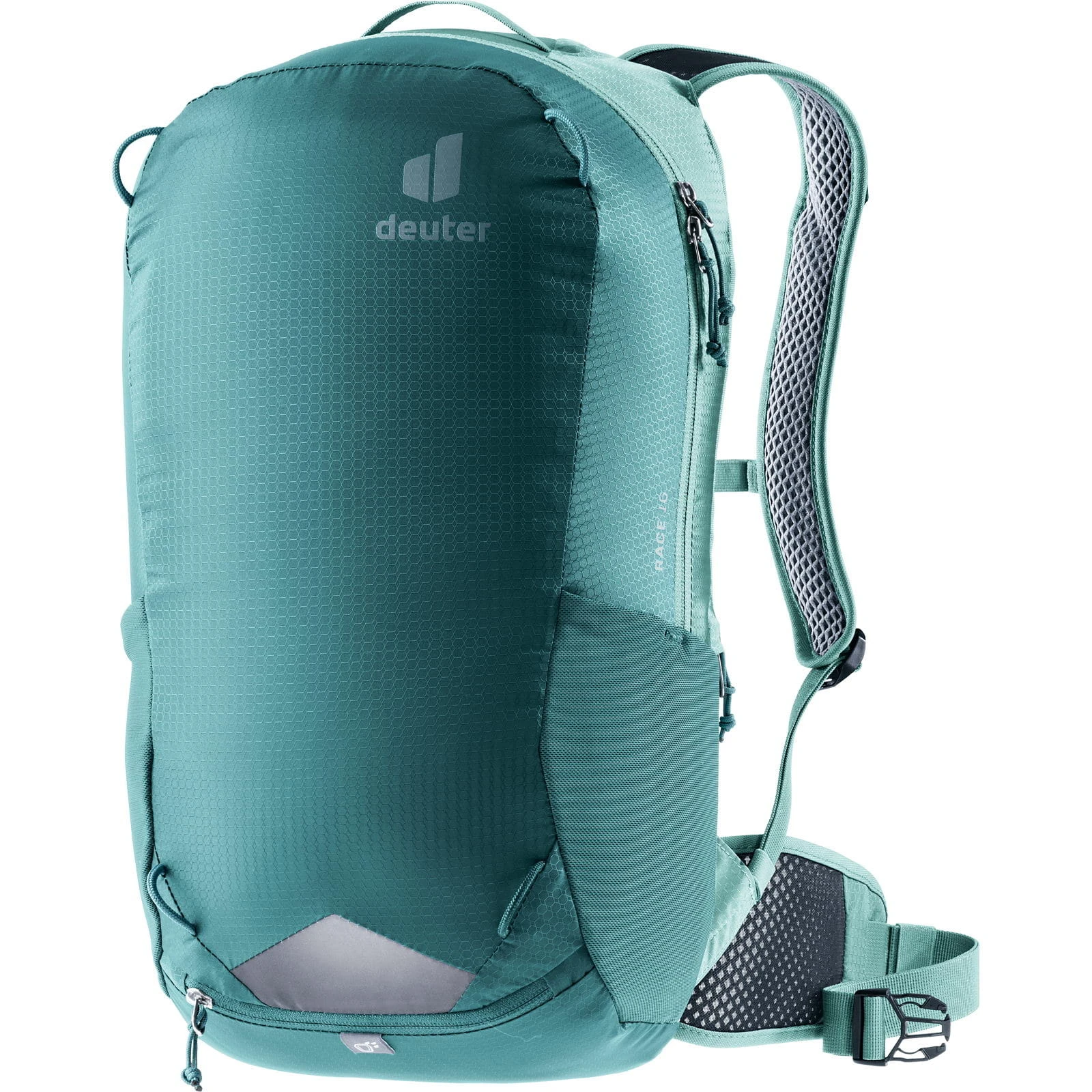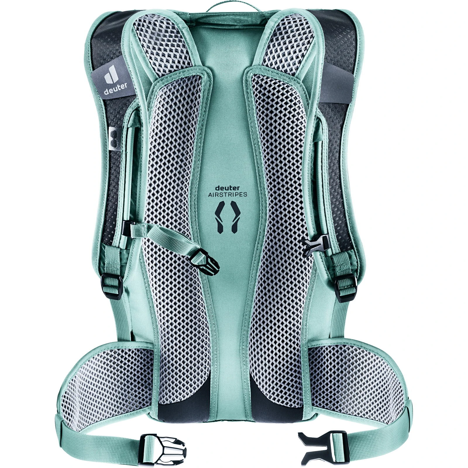 Der Race 16 von deuter ist ein leichter, stabiler Fahrradrucksack mit gutem Gewichts-Komfort-Verhältnis durch Reduktion auf das Wesentliche und luftdurchlässigem Airstripes-Rückensystem. Beste Belüftung und einen kompakten, sicheren Sitz für optimale Fahrsicherheit auch auf sportlichen Trails garantiert das Airstripes-System. Es sorgt dafür, dass der Rucksack eng am Rücken anliegt und nicht verrutscht. Zusätzlich halten der Brustgurt mit neuer, einhändig bedienbarer Brustgurtschnalle und die Netzhüftflossen den Rucksack optimal in Position. Komfortable Bewegungsfreiheit garantieren die ergonomisch S-förmig geschnittenen Schulterträger. Das Leichtgewicht ist mit einem geräumigen Hauptfach, einem Einschubfach zum Verstauen nasser Kleidung oder einer Trinkblase und einem Netz-Reißverschlussfach für Wertsachen ausgestattet. Zwei elastische Seitentaschen bieten Platz für die Trinkflasche und ein seitliches Reißverschlussfach für das Handy. Befestigungsmöglichkeiten für Helmhalterung und Brille, eine mitgelieferte Regenhülle und reflektierende Elemente für mehr Sichtbarkeit im Straßenverkehr runden den Bike-Rucksack ab.