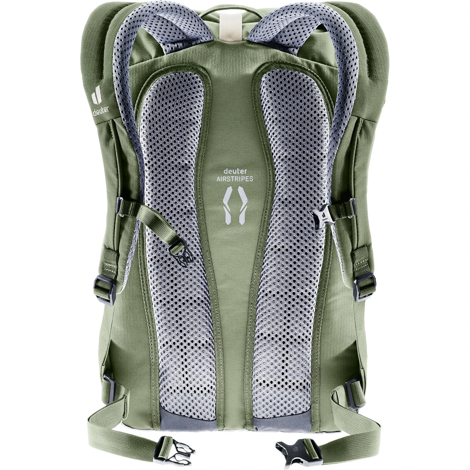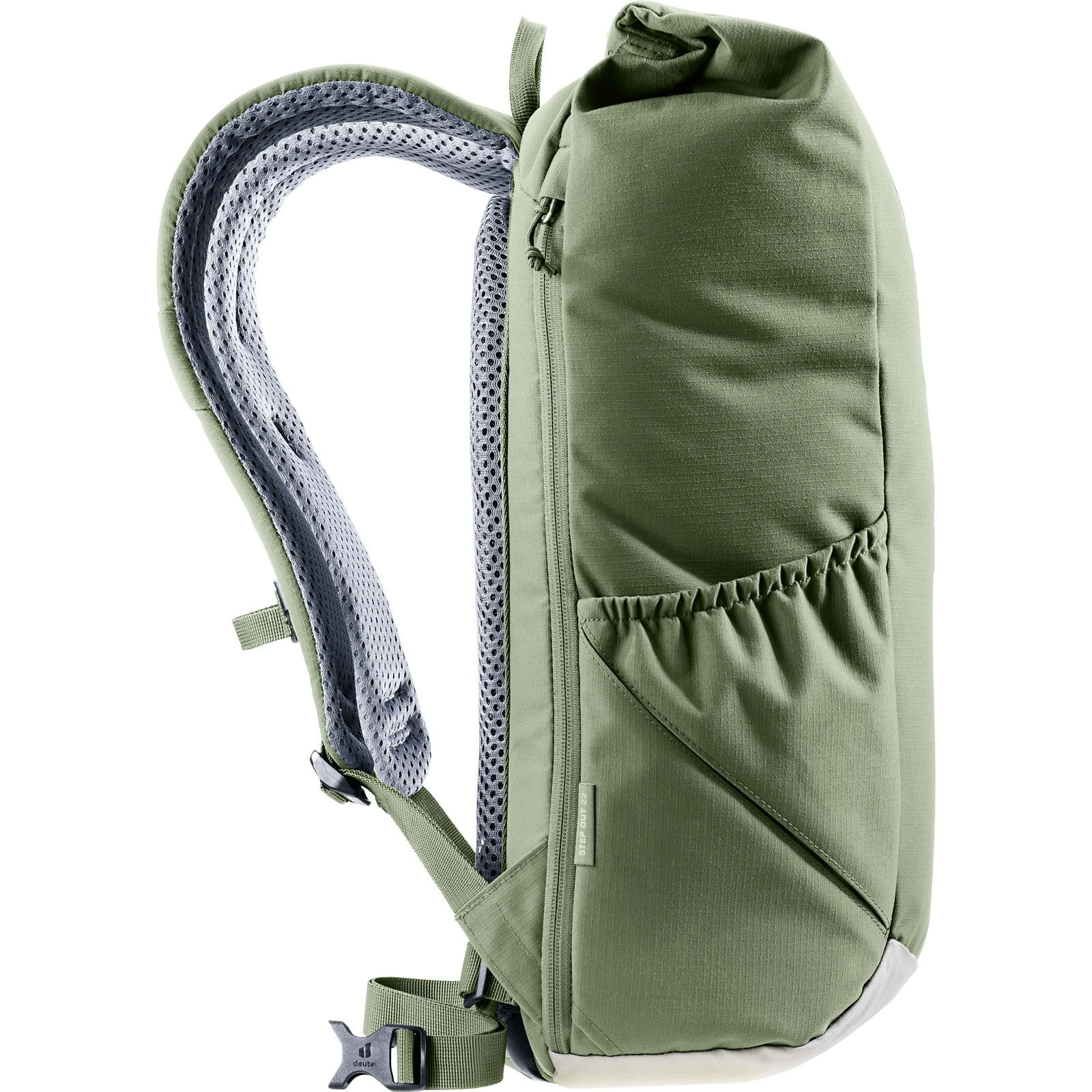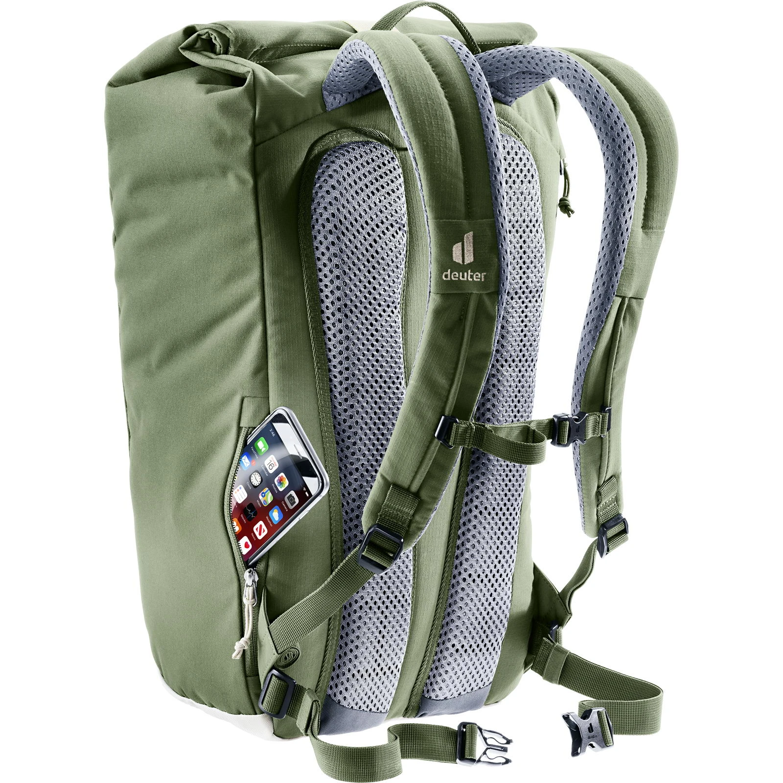 Der StepOut 22 von deuter ist mit 22 Liter Fassungsvermögen der große Daypack aus der Reihe und ein komfortabler, gut belüfteter und super organisierter Alltagsrucksack. Dank perforierter, ergonomischer Schulterträger und geringer Rückenauflage des Airstripes Rückensystems punktet der StepOut 22 mit maximaler Luftzirkulation und hohem Tragekomfort. Der Rolltop-Verschluss mit Volumenerweiterung, das seitliche Handyfach mit Reißverschluss und die elastische Seitentasche sorgen für schnellen Zugriff auf den Rucksackinhalt und die wichtigsten Dinge. Der Alltagsrucksack kann von oben durch den Rollverschluss aber auch über einen Seitenreißverschluss geöffnet werden. Im geräumigen Hauptfach bietet ein Dokumentenfach, ein Tabletfach, zwei kleinere Einschubfächer und ein Reißverschluss-Netzfach mit Schlüsselclip eine gute Organisation und genügend Platz für alles, was auf dem Weg zur Arbeit, zur Schule, in die Uni oder Stadt dabei sein muss. Das Material ist recyceltes, bluesign-zertifiziertes Polyestermaterial, robust, langlebig, wasser- und schmutzabweisend. Um die wasser- und schmutzabweisenden Eigenschaften des Tagesrucksacks sicherzustellen, verwendet deuter eine gesundheitlich unbedenkliche und umweltverträgliche DWR (Durable Water Repellency) Beschichtung, die vollständig auf PFC verzichtet. Diese spezielle Oberflächenbehandlung bewirkt, dass Wasser auf der Außenseite der Textilien abperlt. So bleibt das Material trocken und die Natur sauber.