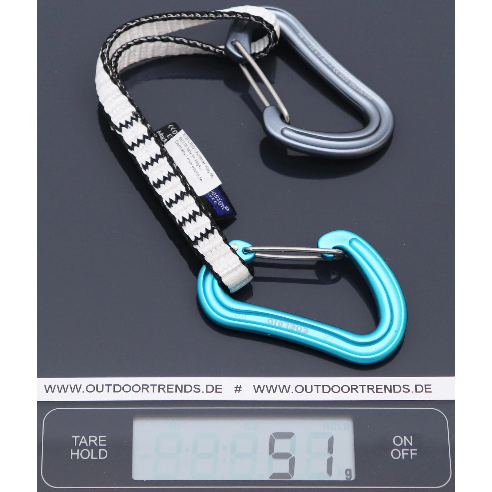 Das Nineteen G Set II von Edelrid ist eines der leichtesten Express-Sets am Markt und ideal für alpine Unternehmungen oder immer dann, wenn jedes Gramm zählt. Die ultraleichten Nineteen G Karabiner mit der H-Profil Konstruktion für bestmögliche Materialausnutzung bei minimalem Gewicht und eine hochfeste 11 mm Dyneema®-Expressschlinge können das Gewicht der Ausrüstung signifikant reduzieren. Ein leichter Drahtschnapper im unteren Karabiner reduziert das Risiko des Whip-Lash-Effekts.