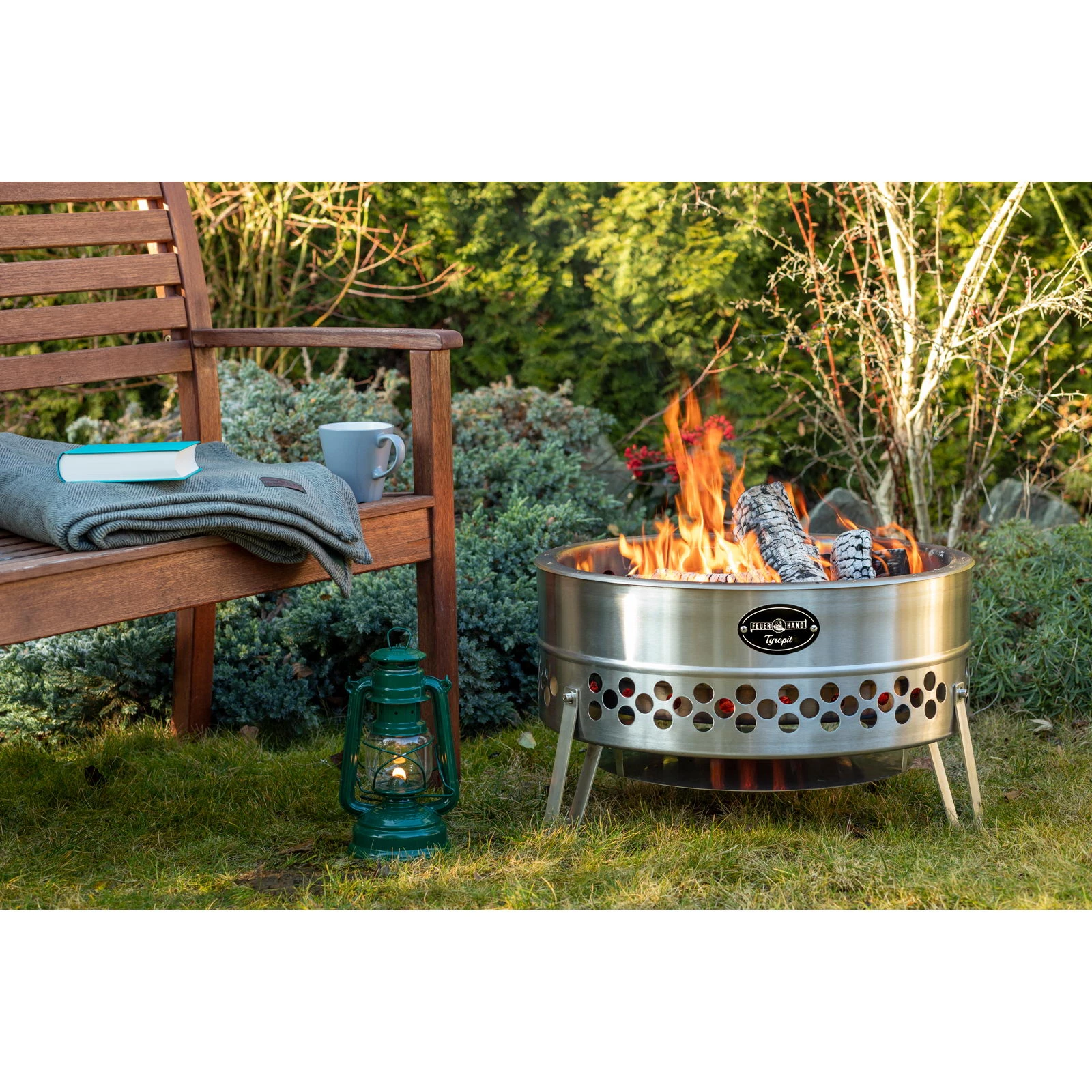 Gemütliche Stunden zu Hause bei entspannter Atmosphäre garantiert: Die Feuerhand Feuerschale Tyropit liefert zuverlässig Licht und Wärme und bringt das Knistern in jede Terrassenrunde. Die doppelwandige Feuerschale aus Edelstahl eignet sich hervorragend, um gesellige Abende mit Familie oder Freunden bei Stockbrot und Würstchen am Spieß zu verbringen. Mit einer Standhöhe von etwa 35 cm hat der Tyropit die ideale Größe, um sich gemeinsam rund um die Feuerschale zu versammeln. Zudem wärmt die Feuerschale von Feuerhand nicht nur auf angenehmer Höhe, sondern besticht auch durch ihre geschmackvolle Ausgestaltung im zeitlosen Industriechic. Die aus der Feuerhand Entwicklung stammende Tyropit ist die perfekte Symbiose aus Form und Funktion. Mit ihr wird das Prinzip der Feuerschale neu definiert und ansprechend verpackt: Konstante Luftzufuhr von unten sowie die zusätzliche Sauerstoffzuführung durch den doppelwandigen Korpus erzeugen eine effektive Holzverbrennung. Die entstehende Sekundärverbrennung sorgt für einen ruß- und raucharmen Betrieb. Die Luftzufuhr in der Mitte deines Terrassenfeuers versorgt die Flammen zusätzlich mit Sauerstoff. So können die Gäste anregenden Gespräche bei wohligem Ambiente folgen. Die Glut wird auf dem herausnehmbaren Kohlerost zusammengehalten, während Verbrennungsrückstände in der ebenfalls entfernbaren Ascheschale mit Funkendom aufgefangen werden. Dadurch bleibt das Feuer am Knistern und die Kaminstimmung für den Garten garantiert. Der Funkendom verhindert zudem das Herausfallen von Glut oder Funken und ein Hitzeschild am Boden schont den Untergrund. Auf drei Standbeinen ruhend steht die Tyropit stabil und kippsicher. Der Edelstahlkorpus ist dabei nicht nur besonders robust und hitzebeständig, sondern bildet mit der Zeit eine charmante Patina aus. Diese Materialverfärbung ist normal und abhängig von Hitzegrad, Befüllung und Art des Brennmaterials. Verbrennungsrückstände fallen automatisch in die Ascheschale mit integriertem Funkendom herab und werden dort sicher und sauber aufgefangen. Nach dem Betrieb und Auskühlen des Tyropit wird der Kohlerost herausgenommen und die abgekühlte Asche kann so einfach entfernt werden. Die restlichen Bestandteile werden danach mit einem Handfeger gesäubert und die Feuerhand Tyropit ist bereit, um die nächste Gartenparty in stimmungsvollem Licht zu erhellen.