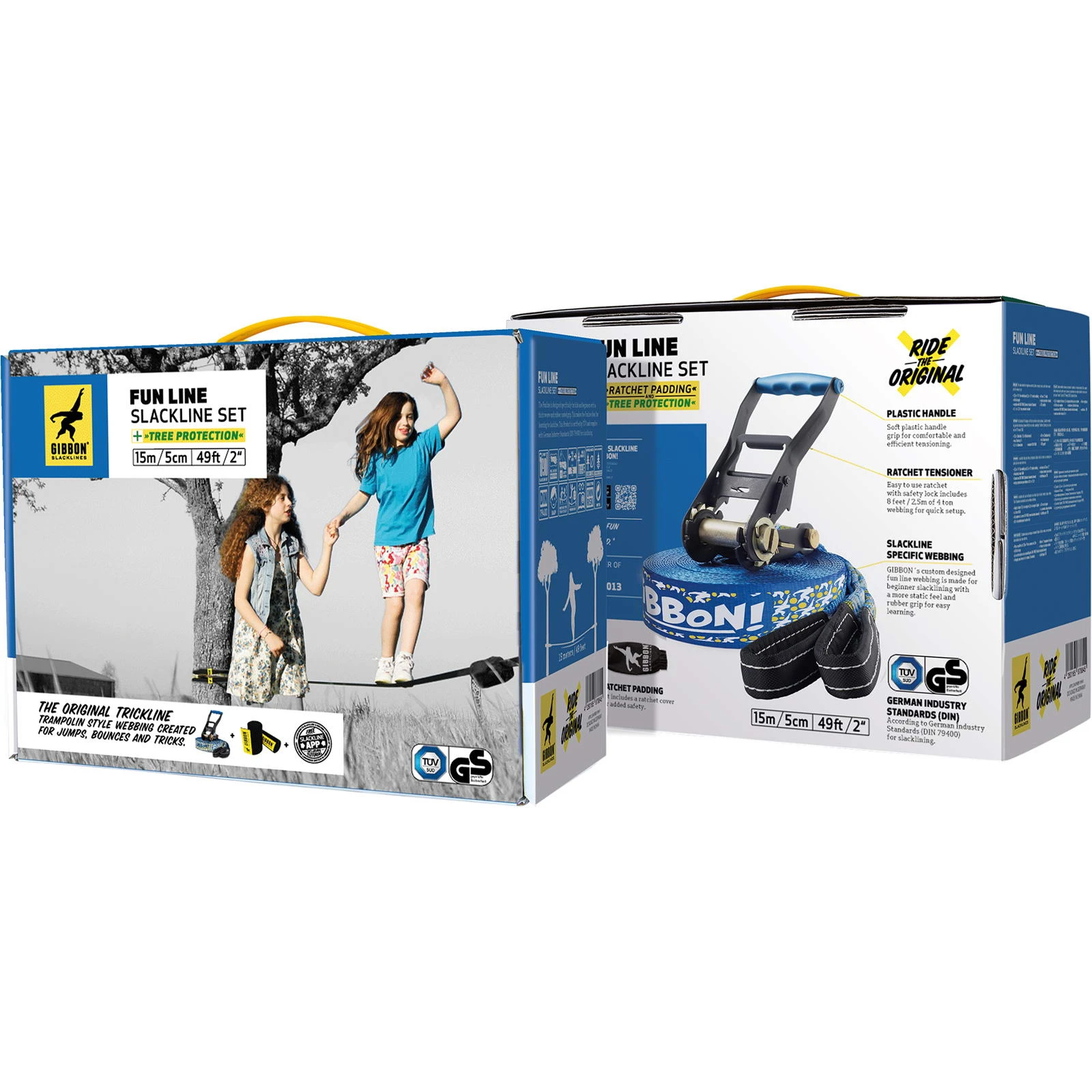 Die geringe Dehnung der Fun Line (als TreeWear Set) von Gibbon Slacklines erlaubt einen niedrigeren Aufbau und ist somit ideal für Kinder und Anfänger. Die gummierte Bedruckung verleiht einen noch besseren Halt bei den ersten wackeligen Schritten. Mit integriertem Ratschenschutz entspricht das Set den DIN Richtlinien für Slacklinen und den Anforderungen des deutschen TÜV. Die Gibbon Fun Line ist überall schnell und einfach aufgebaut und kommt inklusive Baumschoner.