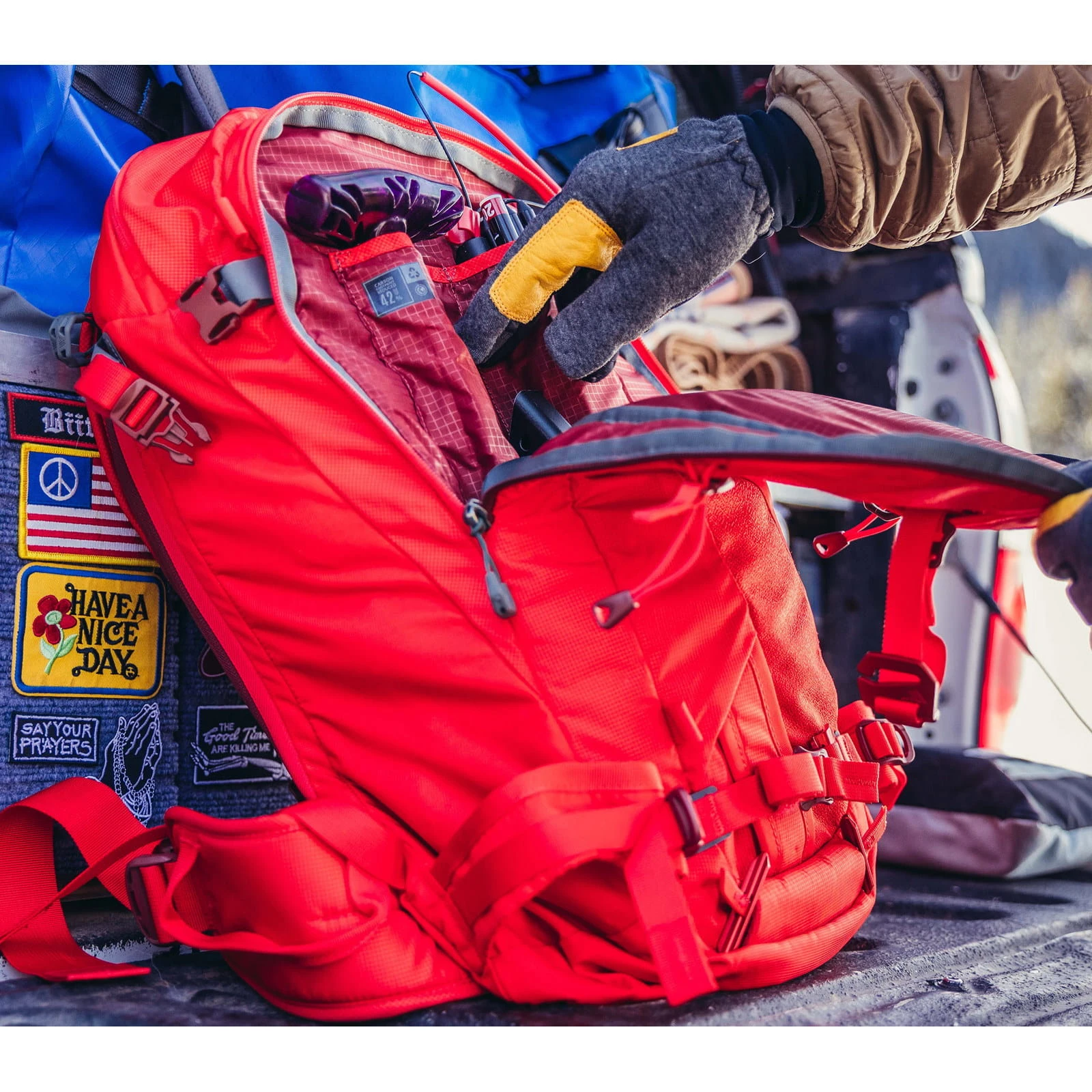 | Merkmale | A-Frame Skibefestigung, diagonale Skibefestigung, Einschubfach im Hauptfach, Eisgerätehalterung, gepolsterter Hüftgurt, gepolsterter Tragegriff oben, höhenverstellbarer Brustgurt, isolierte Trinkschlauchführung auf dem rechten Schulterträger, Materialschlaufe an einem Hüftflügel, Materialschlaufen auf den Schulterträgern für Brille etc., Pickelhalterung, reflektierende Elemente, Reißverschlussfach auf einem Hüftflügel, Reißverschlussfach oben, Reißverschlussfach oben groß genug für Skibrille, Reißverschlussfach vorne, Schlauchdurchführung für Trinksystem, Schlüsselhalterung, Schneeschuhbefestigung, seitliche Kompressionsriemen, seitliche Skibefestigung (Skibreite max. 130 mm), Snowboardbefestigung, Stockhalterung, verstaubare Helmhalterung, vorderes Hauptfach für Schaufel, Sonde, etc., Zugang ins Hauptfach über Rückenöffnung |