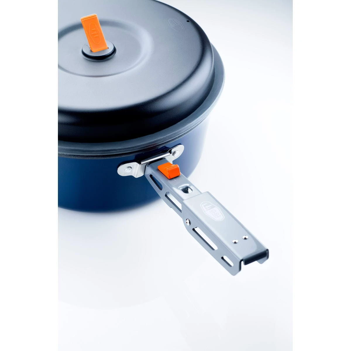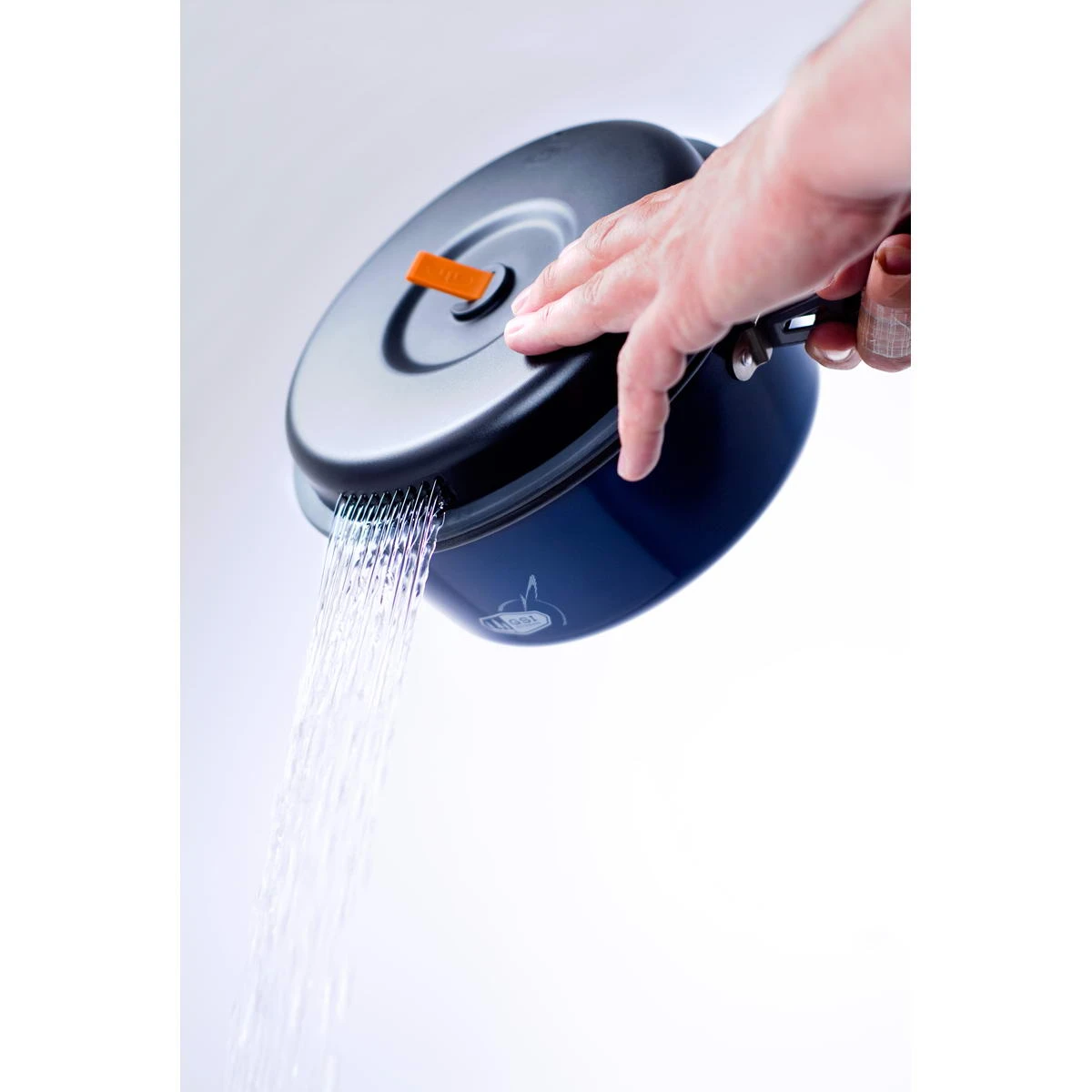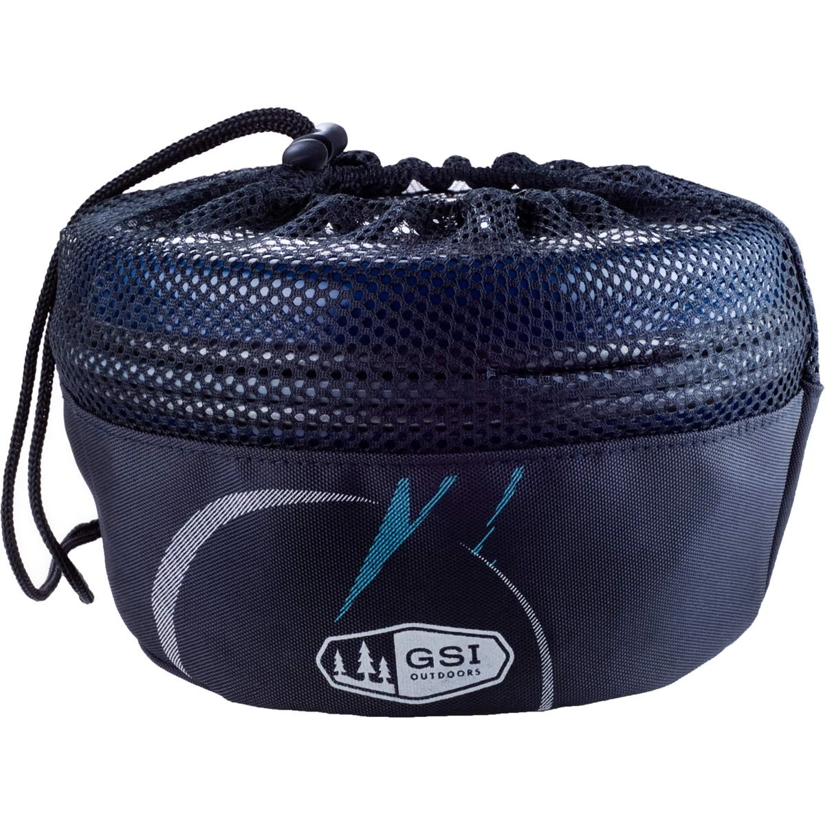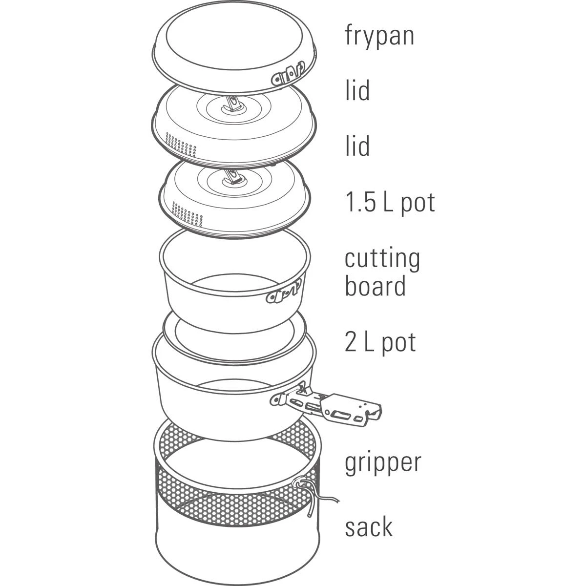 Das Kochset Bugaboo Base Camper in Größe small von GSI bietet beste Qualität bei den Topfmaterialien, eine ausgefeilte Ausstattung des Topfsets und ein sehr gutes Finish. Das GSI Bugaboo Base Camper small hat eine Teflon Beschichtung, welche gutes Handling und einfaches Reinigen sowie Abrieb- und Kratzfestigkeit der Töpfe garantiert. Das Set beinhaltet zwei Töpfe, eine Deckelpfanne, zwei Abgießdeckel, das praktische Schneidebrett (dient auch als Zwischenlage der Töpfe, damit diese nicht beim Transport klappern), die GSI-Komfortgriffzange und einen Packsack.