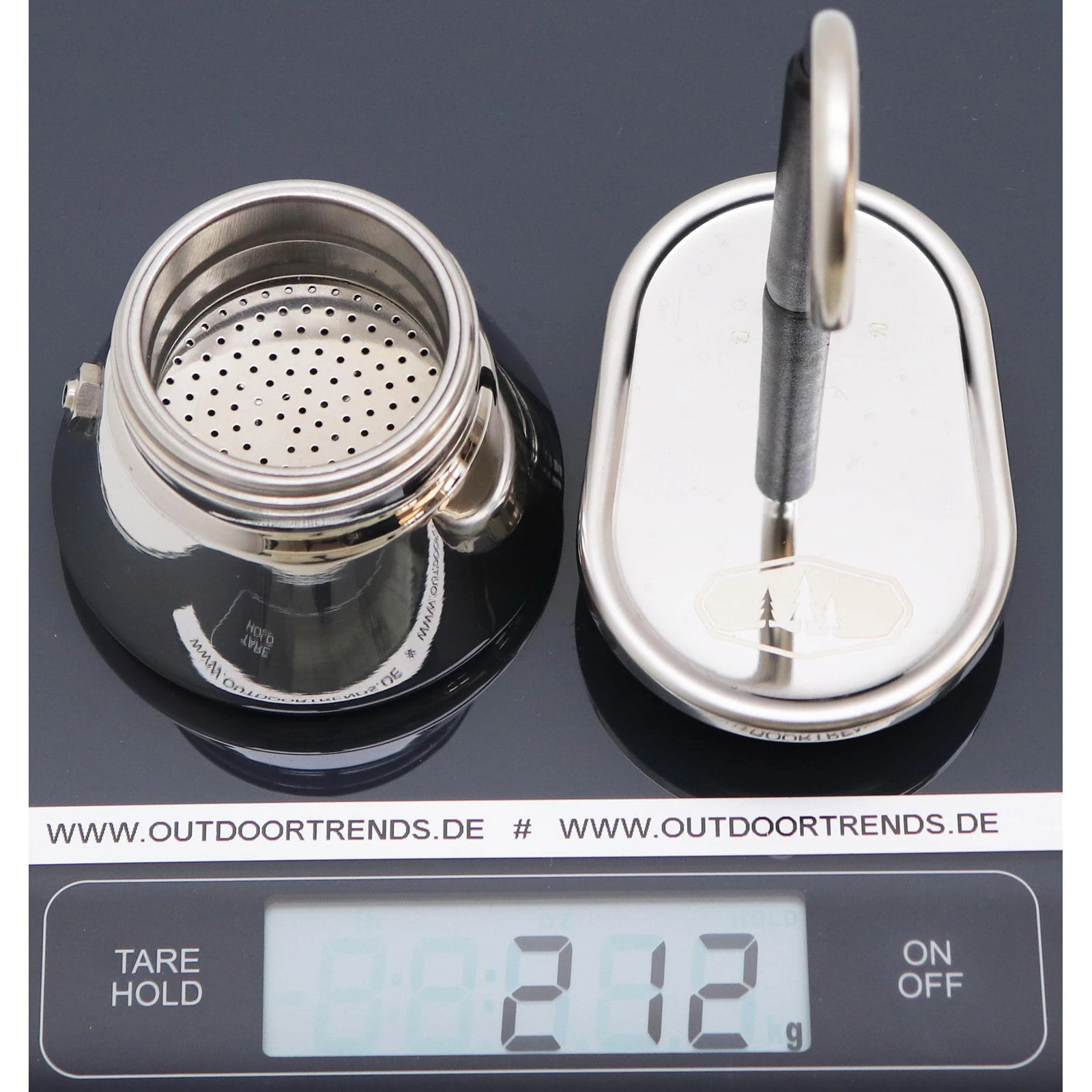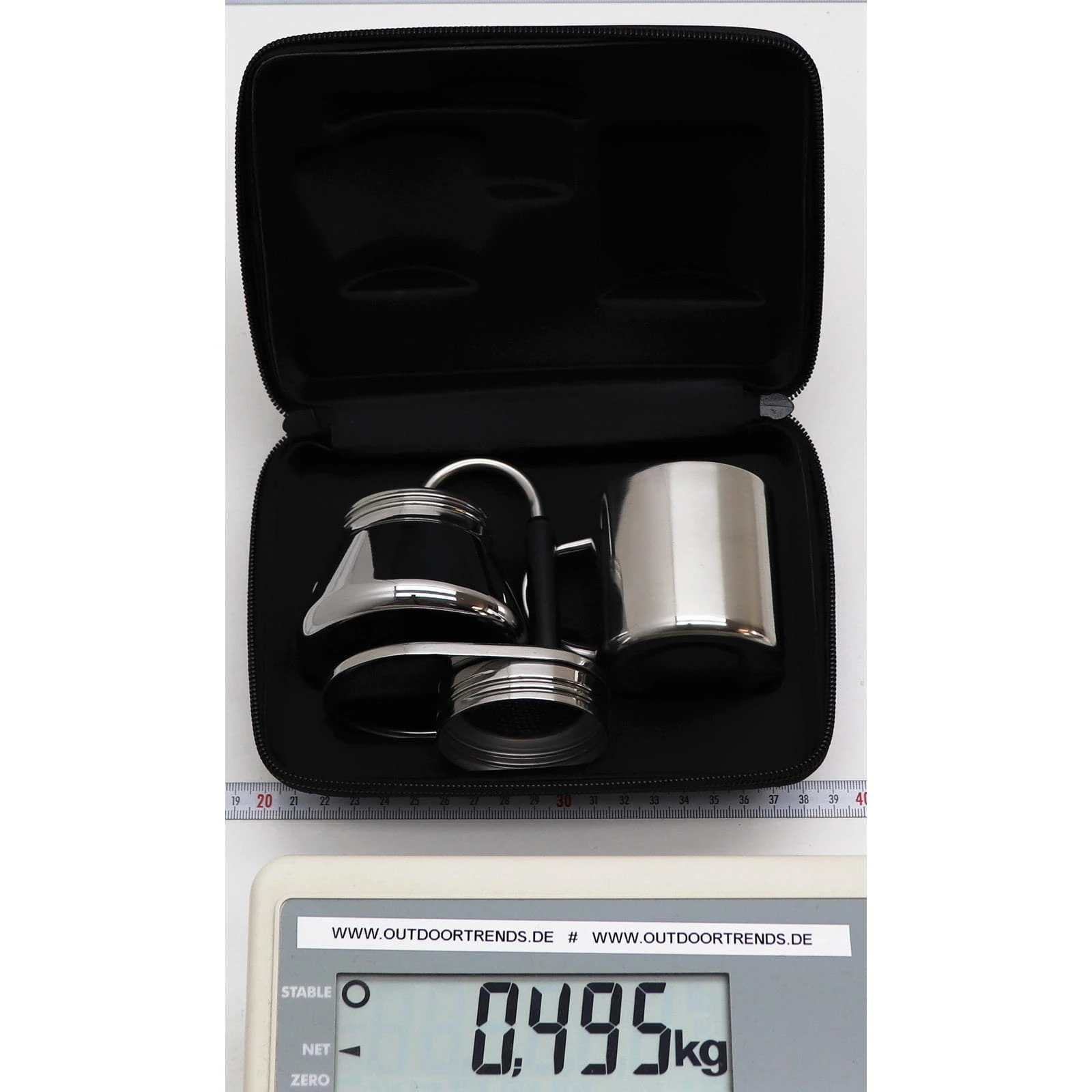 | Gewicht ca. | Tasse: 78 g, Transportcover: 205 g, Espressokocher: 212 g, gesamt: 495 g |