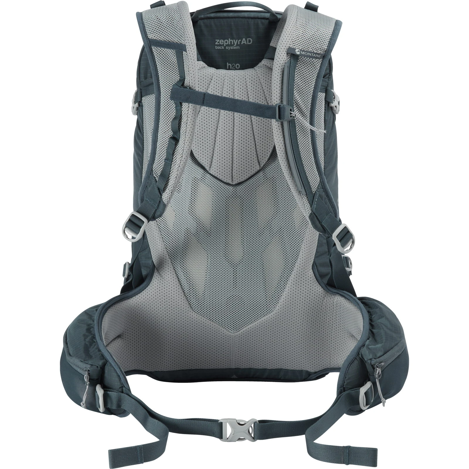 Der Azote 25 von Montane besitzt das anpassbare ZephyrAD Rückensystem mit einem Klettverschlusssystem, welches ein leichtes verstellen der Größe ermöglicht. Zudem enthält das Rückenpolster Lüftungskanäle, welche die Feuchtigkeit abwendet und den Tragekomfort erhöhen. Der Wanderrucksack besitzt versetzte Click and Go Brustgurte, die beliebig verstellt werden können. Der vorgeformte Hüftgurt mit Reißverschlussfächer und Trageriemen bieten ein angenehmes Tragen. Der Rucksack verfügt unter anderem über zwei seitliche Taschen aus Meshmaterial, ein dehnbares Vorderfach, seitliche Kompressionsriemen und einer Stockhalterung.