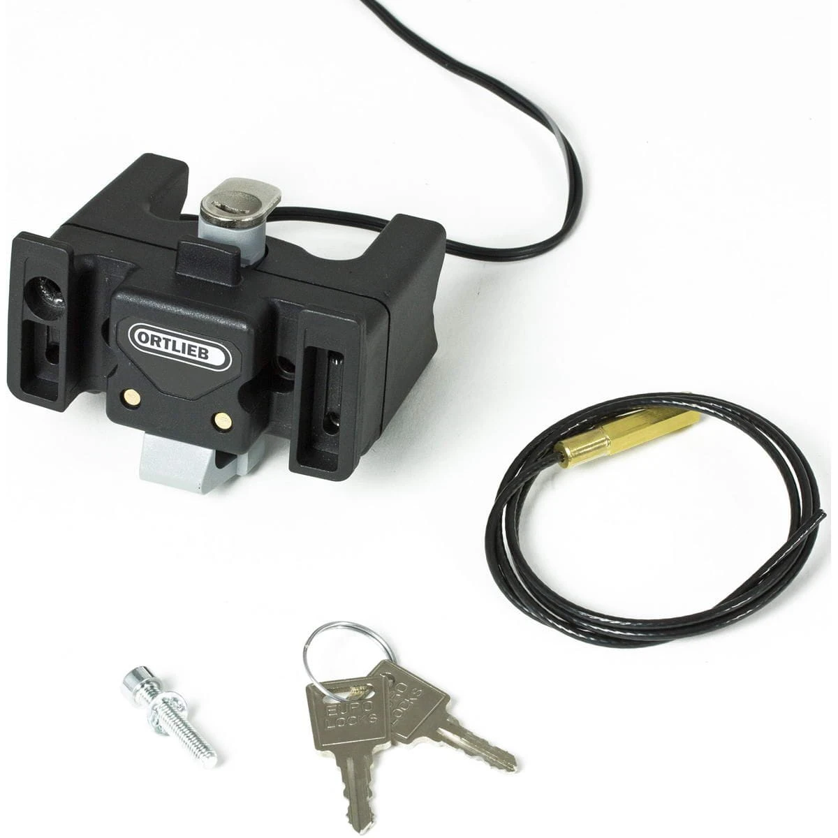 Montage-Set für Ultimate Six (ehemals Ultimate6) M Pro E von ORTLIEB. Abschließbarer Halterungsblock mit einfacher Seilbefestigung für ORTLIEB Ultimate Six M Pro E Lenkertaschen als Ersastz oder für ein weiteres Fahrrad. Komplettes Montage-Set, abschließbar. Für Carbon-Lenker also nicht geeignet!