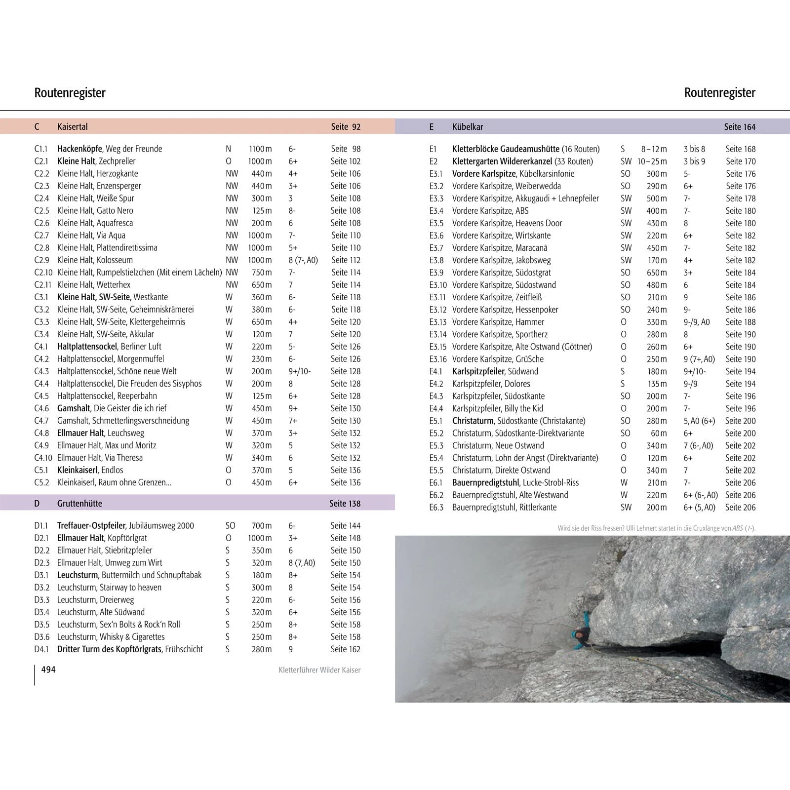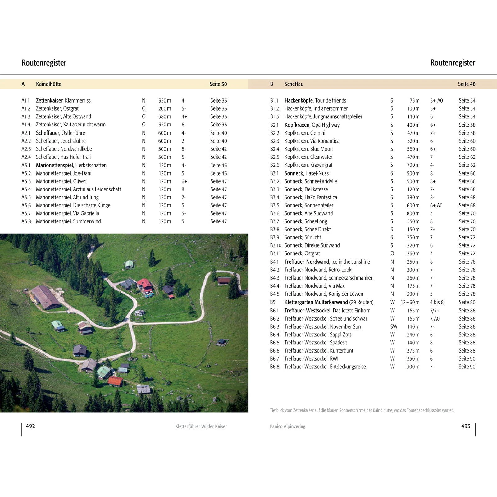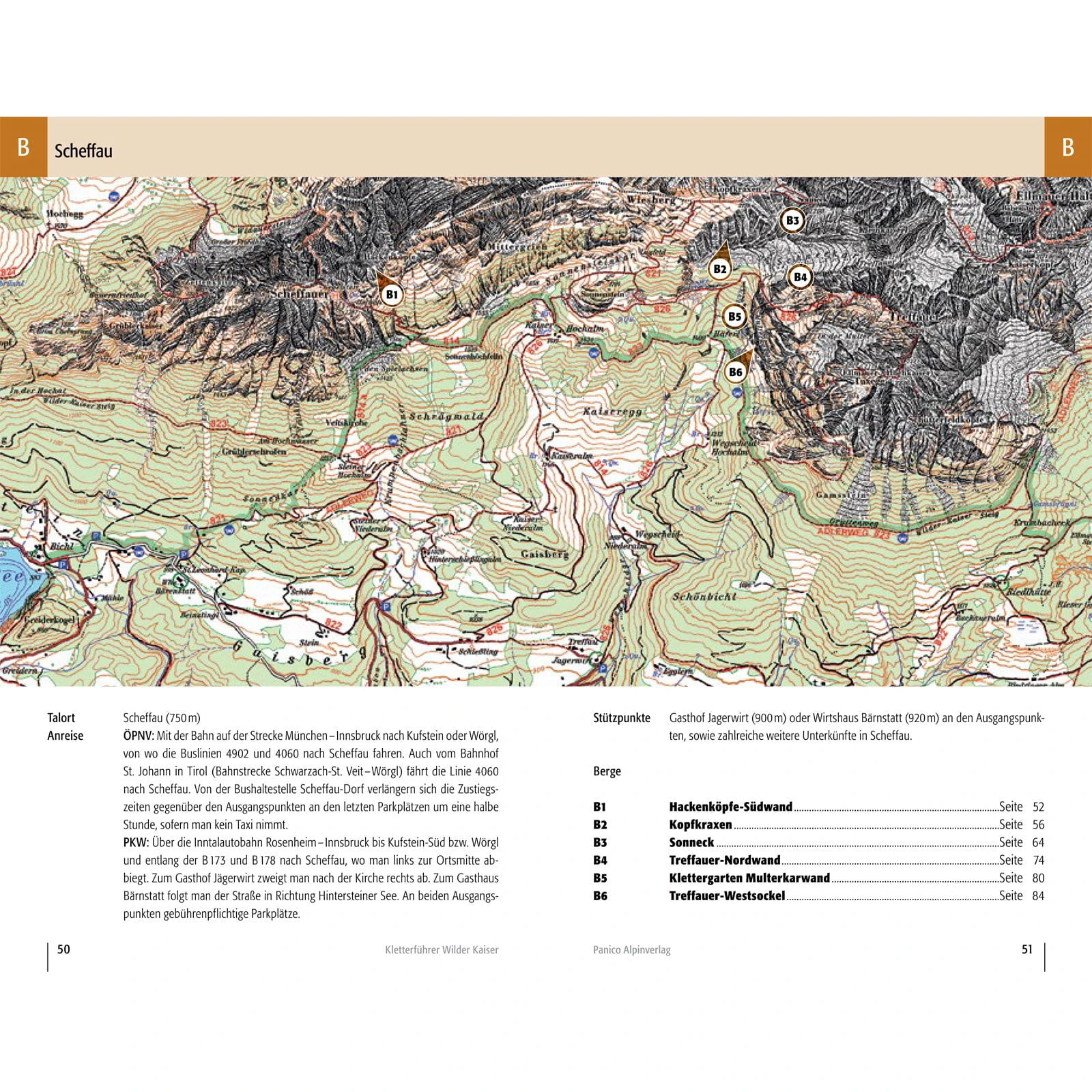 Kaindlhütte: Zettenkaiser; Scheffauer; Westlicher Hackenkopf, Marionettenspiel / Scheffau: Hackenköpfe-Südwand; Kopfkraxen; Sonneck; Treffauer-Nordwand; Klettergarten Multerkarwand; Treffauer-Westsockel / Kaisertal: Hackenköpfe-Nordwand; Kleine Halt; Kleine-Halt-Südwestseite; Gamshalt- und Ellmauer-Halt-Westwand; Kleinkaiserl-Ostwand / Gruttenhütte: Treffauer-Südostwand; EllmauerHalt; Leuchsturm; Dritter Turm des Kopftörlgrats / Kübelkar: Kletterblöcke Gaudeamushütte; Klettergarten Wildererkanzel; Vordere Karlspitze; Karlspitzpfeiler; Christaturm; Bauernpredigtstuhl / Stripsenjochhaus: Fleischbank-Ostwand; Fleischbankpfeiler; Predigtstuhl-Nordgipfel-Westwand; Predigtstuhl-Mittelgipfel-Westwand; Predigtstuhl-Hauptgipfel-Westwand; Predigtstuhl-Ostwand; Hintere Goinger Halt / Steinerne Rinne: Fleischbank-Ostwand; Fleischbankpfeiler; Predigtstuhl-Nordgipfel-Westwand; Predigtstuhl-Mittelgipfel-Westwand; Predigtstuhl-Hauptgipfel-Westwand; Predigtstuhl-Ostwand; Hintere Goinger Halt / Ackerlhütte: Kreuztörlturm; Törlwand; Regalpwand, Gildensteigwand; Westliche Hochgrubachspitze; Östliche Hochgrubachspitze; Ackerlspitze; Waxensteiner Turm; Niedersessel; Maukspitze / Kaiserbachtal: Lärcheck; Hintere Gamsflucht; Mitterkaiser-Ostwand; Mitterkaiser-Nordwand; Mitterkaiser-Westwand; Kleinkaiser; Mariandlwandl