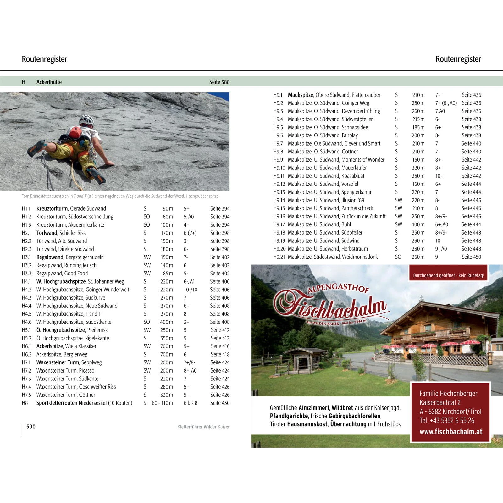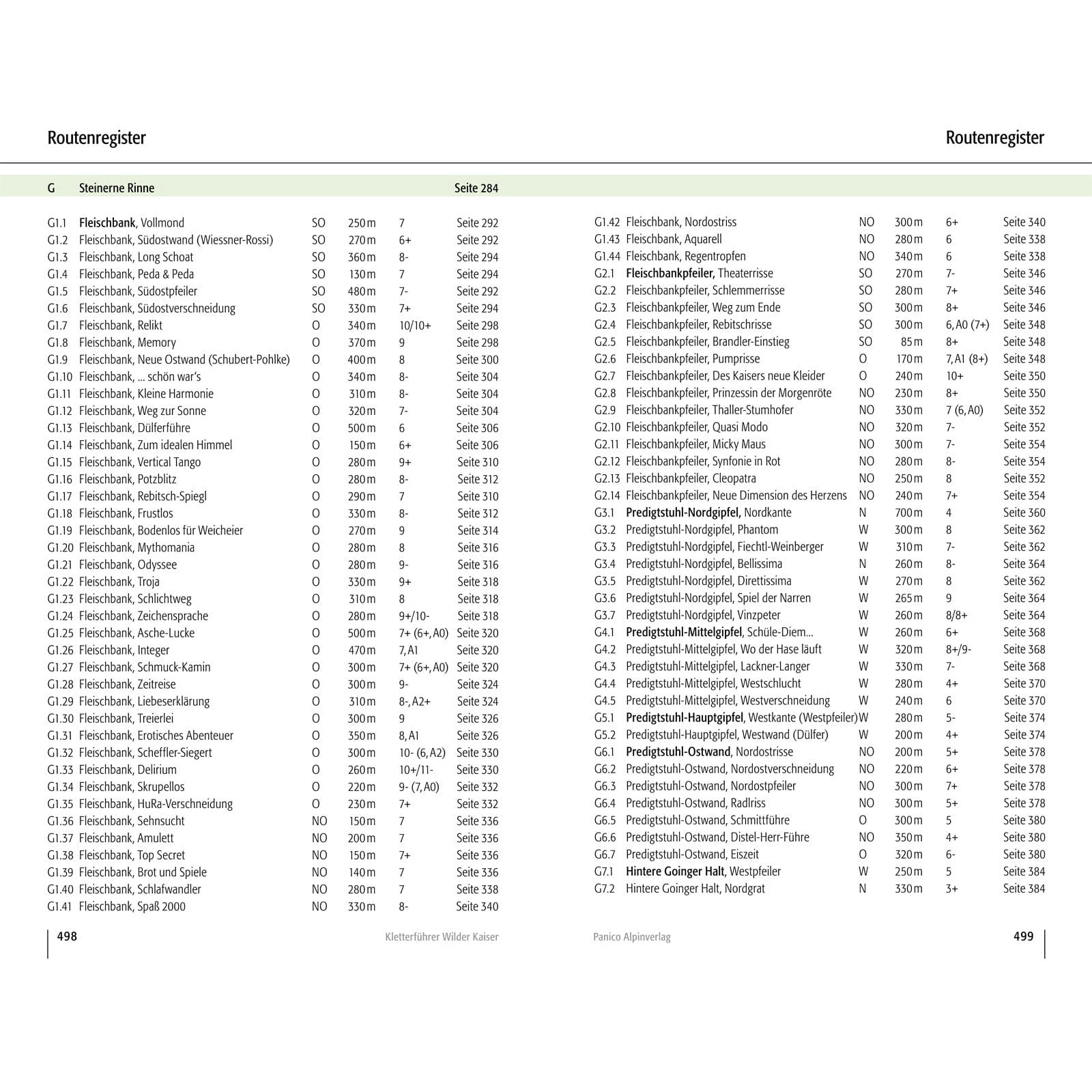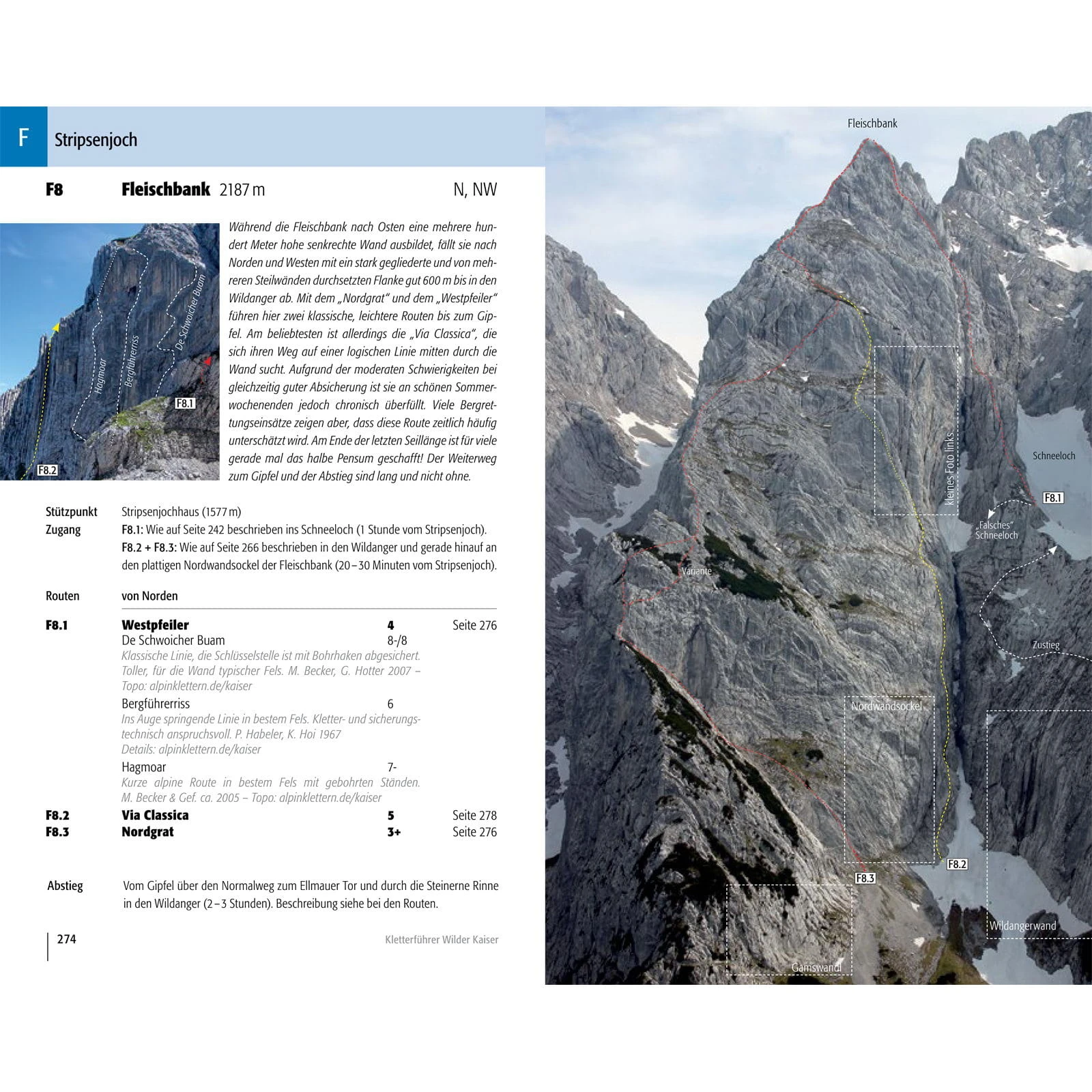 Kaindlhütte: Zettenkaiser; Scheffauer; Westlicher Hackenkopf, Marionettenspiel / Scheffau: Hackenköpfe-Südwand; Kopfkraxen; Sonneck; Treffauer-Nordwand; Klettergarten Multerkarwand; Treffauer-Westsockel / Kaisertal: Hackenköpfe-Nordwand; Kleine Halt; Kleine-Halt-Südwestseite; Gamshalt- und Ellmauer-Halt-Westwand; Kleinkaiserl-Ostwand / Gruttenhütte: Treffauer-Südostwand; EllmauerHalt; Leuchsturm; Dritter Turm des Kopftörlgrats / Kübelkar: Kletterblöcke Gaudeamushütte; Klettergarten Wildererkanzel; Vordere Karlspitze; Karlspitzpfeiler; Christaturm; Bauernpredigtstuhl / Stripsenjochhaus: Fleischbank-Ostwand; Fleischbankpfeiler; Predigtstuhl-Nordgipfel-Westwand; Predigtstuhl-Mittelgipfel-Westwand; Predigtstuhl-Hauptgipfel-Westwand; Predigtstuhl-Ostwand; Hintere Goinger Halt / Steinerne Rinne: Fleischbank-Ostwand; Fleischbankpfeiler; Predigtstuhl-Nordgipfel-Westwand; Predigtstuhl-Mittelgipfel-Westwand; Predigtstuhl-Hauptgipfel-Westwand; Predigtstuhl-Ostwand; Hintere Goinger Halt / Ackerlhütte: Kreuztörlturm; Törlwand; Regalpwand, Gildensteigwand; Westliche Hochgrubachspitze; Östliche Hochgrubachspitze; Ackerlspitze; Waxensteiner Turm; Niedersessel; Maukspitze / Kaiserbachtal: Lärcheck; Hintere Gamsflucht; Mitterkaiser-Ostwand; Mitterkaiser-Nordwand; Mitterkaiser-Westwand; Kleinkaiser; Mariandlwandl