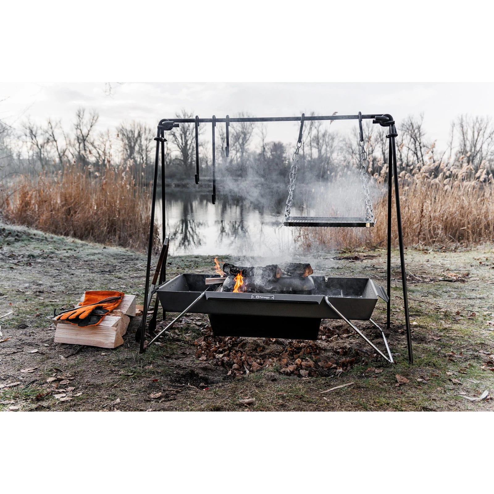 Der Brennbock ist deine flexible und transportable Feuerschale im Freien, mit der du die vielfältige Lagerfeuerküche überall entdecken kannst. Dank einem Füllvolumen von 50 l für Brennholz, Holzkohle oder Grillbriketts versammelst du ganz einfach eine große Truppe um dich, um Menüs überall dort zu kochen, wo dich dein Abenteuer hin verschlägt. In der Feuerschale aus Stahl werden die Flammen gebändigt, denn der hohe Rand schützt das Feuer und ermöglicht eine saubere Feuerstelle. Dank des Aufbockens durch zwei einfach zu installierende Standbügel kannst du dein Feuer mit genügend Abstand zum Boden entfachen. So hinterlässt du keine Spuren, wenn dein Draußen-Kochabenteuer mit der hitzebeständigen und unverwüstlichen Feuerschale beginnt. Die Kombination aus Frischluft und Erlebnis macht hungrig: Gönn dir etwas Deftiges, indem du die Feuerbrücke mit dem Brennbock kombinierst oder das Dreibein über der Stahl-Feuerschale errichtest, um auf dem Hängerost Steaks mit unverwechselbaren Grillstreifen zu grillen. Dabei kommt dir die Belastbarkeit des Brennbocks zugute, denn der Brennbock trägt bis zu 100 kg Kochausrüstung. Der Brennbock hilft dir beim gleichzeitigen Servieren mehrerer Gerichte, denn durch das zugehörige Backfach kannst du einen Kartoffelauflauf überbacken, saftige Steaks nachgaren lassen oder dein Bauernfrühstück warmhalten. Im Backfach finden die Feuerpfannen fp15 – fp30 bzw. die Grill-Feuerpfanne gp35-t und die Kastenformen k4 bis k8 (ohne Deckel) den perfekten Platz, bis die herzhaften Gerichte am Feuer verzehrt werden. Wenn du den Brennbock zum ersten Mal montierst, stattest du ihn mit dem Backfach aus und anschließend kannst du ihn im Auto oder Van überall dorthin transportieren, wo du dein Freiluftabenteuer beginnen möchtest. Die robusten Standbeine demontierst du einfach ohne Werkzeug, sodass du sie nach der Reinigung des Brennbocks von Ascherückständen platzsparend in der Wanne lagern kannst.
