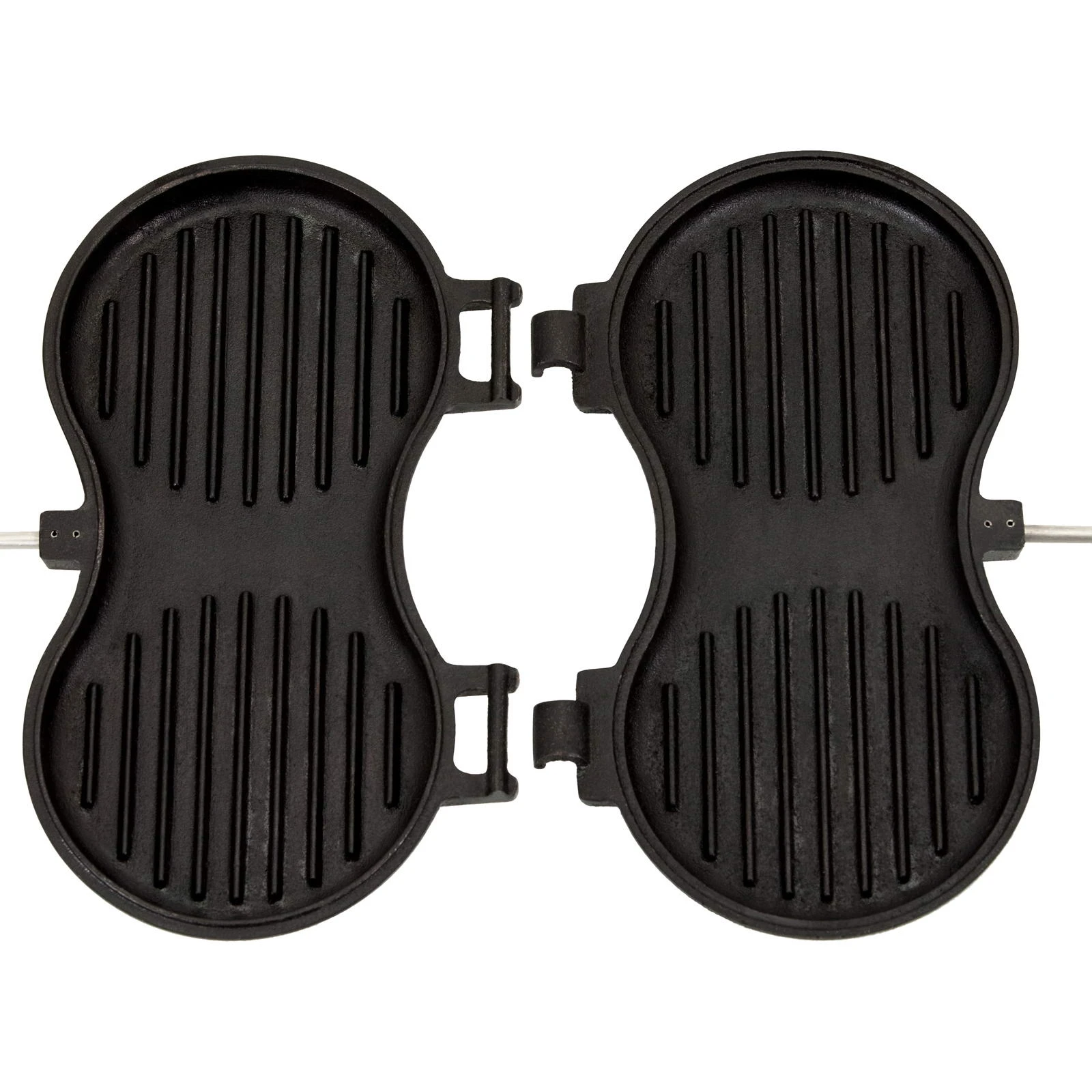 Mit dem Burgereisen von Petromax kann man in den runden Formen mit je zwölf Zentimetern Durchmesser perfekte Burger Patties direkt im Feuer braten. Dank der gerillten Oberfläche bekommen sie das typische Grillmuster. Durch die wärmespeichernden Eigenschaften der gusseisernen Form werden die Burger Patties in den Flammen oder der Glut scharf angebraten und können anschließend mit der Resthitze perfekt gegart werden. Dank der abgeflachten, aufliegenden Holzgriffe und des Verschlusshakens kann man das Burgereisen sicher verschließen und halten. Zum Reinigen können die beiden Formen über das Scharnier einfach voneinander getrennt und einzeln gesäubert werden.