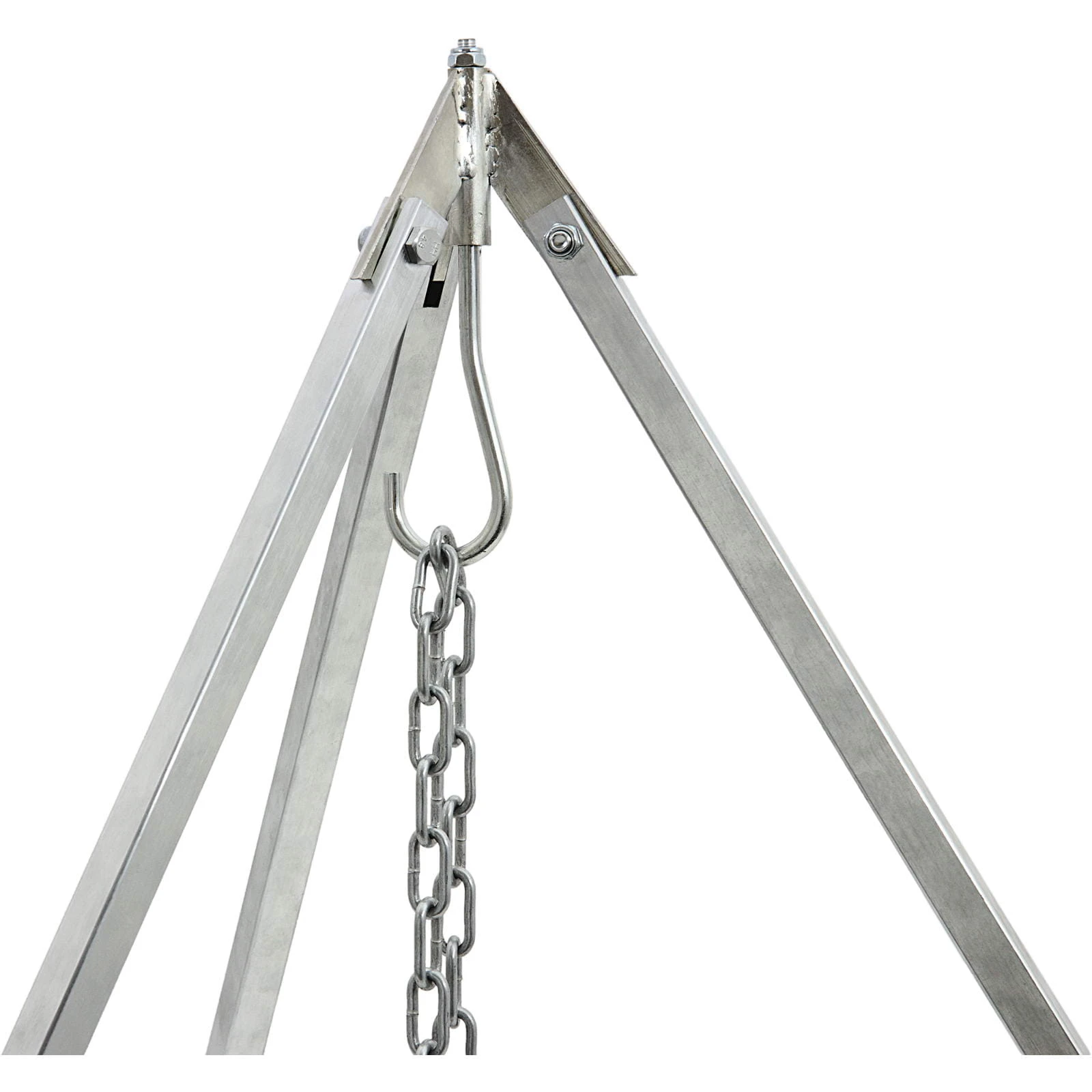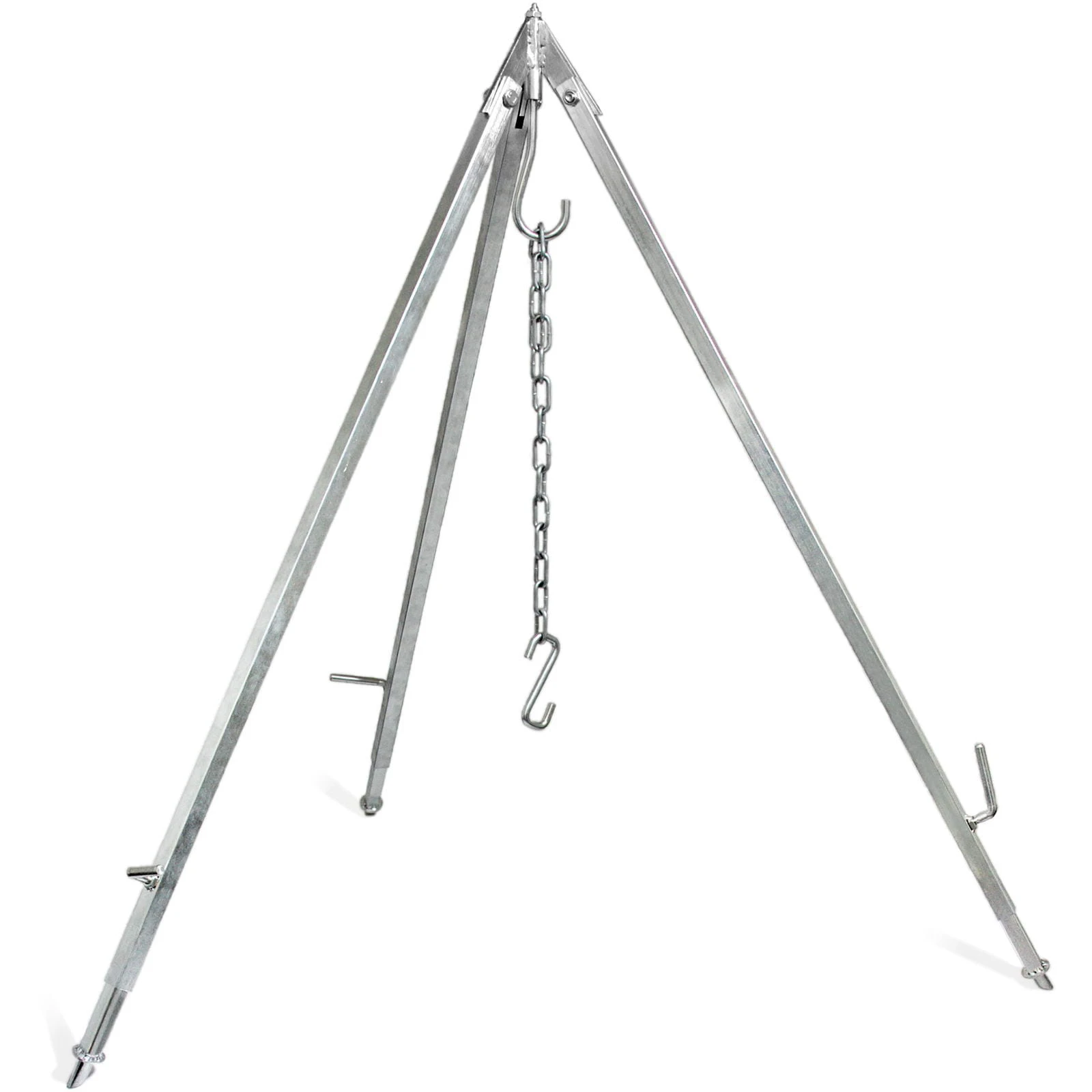 Mit dem Petromax Dreibein perfektionieren Sie Ihre Outdoorküche. An dem Haken des robusten Dreibeins lässt sich ein Grillrost, ein Hordentopf, der Dutch Oven oder ähnliches sicher und einfach aufhängen. Durch die höhenverstellbare Kette gelingt Kochen auf offenem Feuer besonders schonend. Die abgeschrägten Füße sorgen auf den verschiedensten Böden für einen sicheren Stand des Dreibeins. Zudem ist jedes Bein einzeln und stufenlos höhenverstellbar, so dass sich Unebenheiten des Untergrunds mühelos ausgleichen lassen. Die Höhe ist von 88 – 144 cm verstellbar und es kann z.B. bei maximal eingestellter Höhe eine Feuerschale mit 120 cm im Durchmesser und 40 cm Höhe verwendet werden.