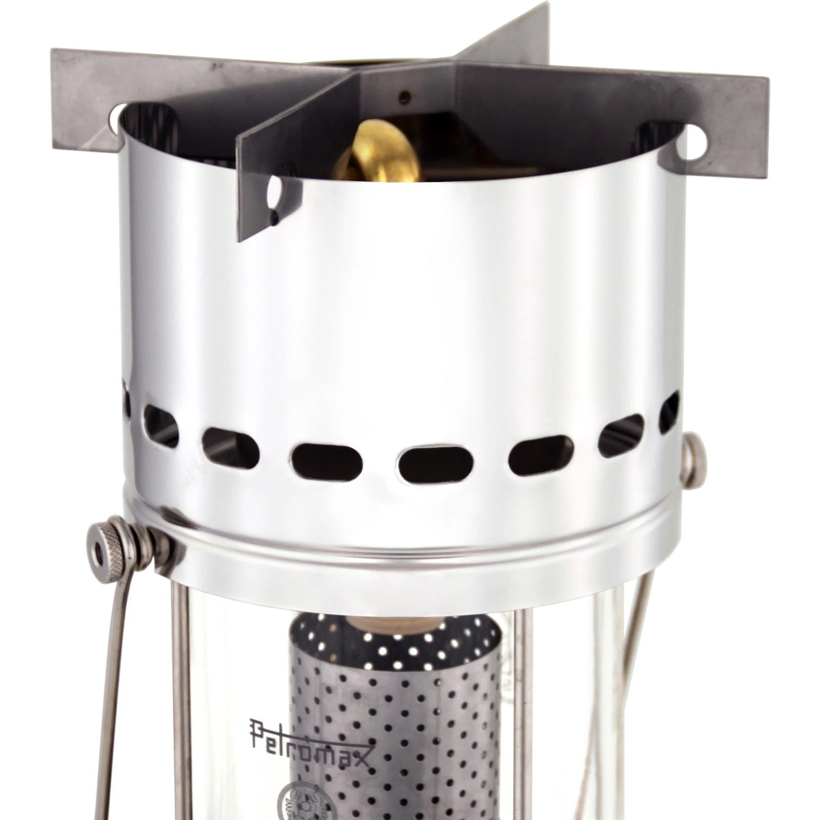 Mit dem Petromax Kochaufsatz lässt sich die Petromax HK350/500 Petroleumlampe schnell und unkompliziert zu einem Kocher erweitern. Dafür wird der Kochaufsatz anstelle der Lampenhaube auf dem Tragegestell montiert. Der Aufsatz ist aus einer hochwertigen Stahllegierung gefertigt und bietet mit einem Durchmesser von 18 cm eine sichere Auflagefläche für Töpfe und Pfannen. Um die Hitze der Lampe optimal zu nutzen, kann der Kochaufsatz durch den Petromax Radiator ergänzt werden. Der Radiator strahlt die Hitze noch stärker nach oben ab.