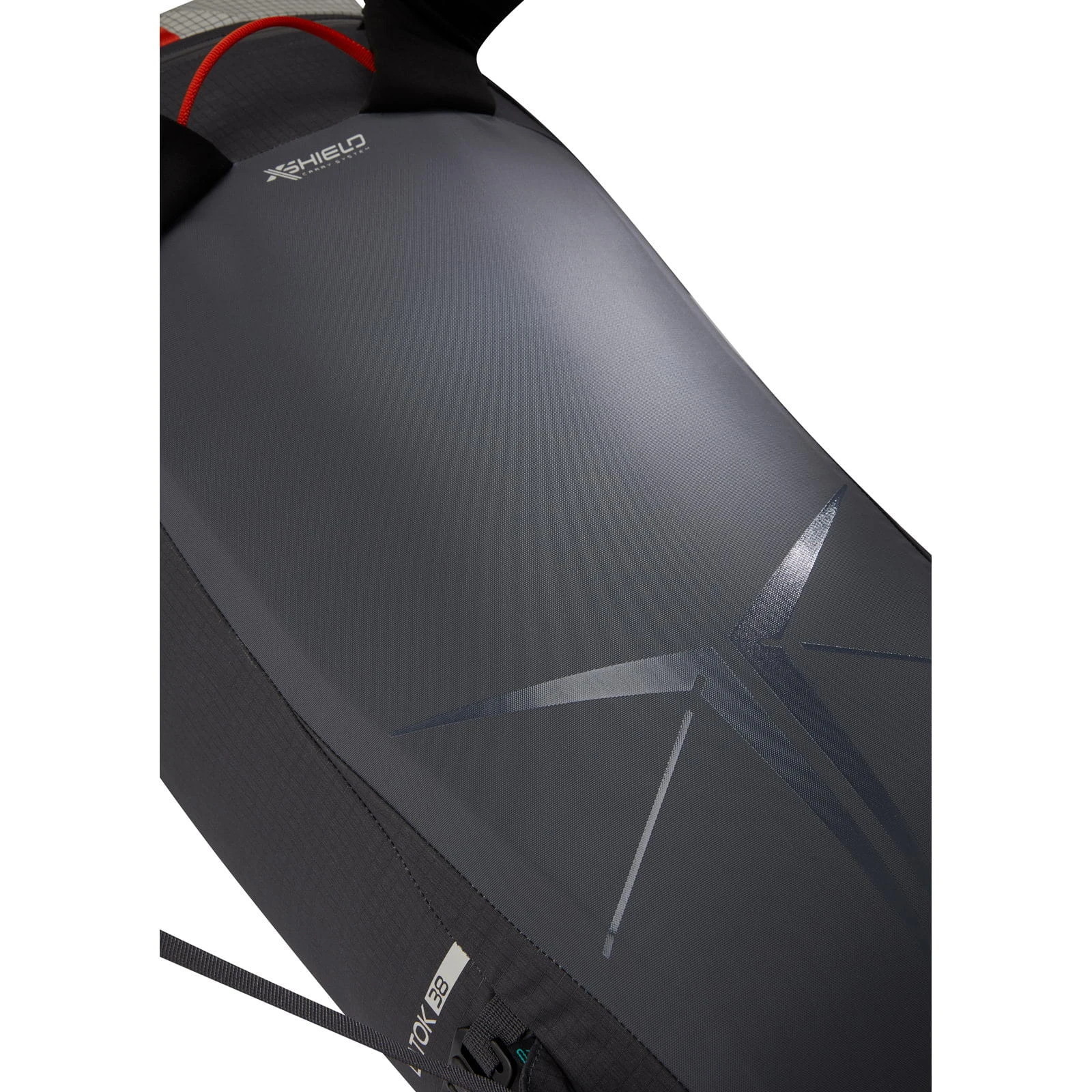 | Merkmale | Brustgurt mit Signalpfeife, Eisgerätehalterung, Fach mit wasserabweisendem Reißverschluss hinten oben, herausnehmbare Rückenplatte, höhenverstellbarer Brustgurt, Hüftgurt mit leicht zu öffnender Schnalle, Innentasche mit Reißverschluss zum Verstauen von Wertsachen, Lastkontrollriemen, leichte Kompressionsriemen mit robusten Metallhaken, die auch als A-Frame-Skibefestigung dienen, Pickelhalterung, Rollverschluss (Wickelverschluss), Schlüsselclip, Seilfixierung oben, seitliche Materialschlaufen, SOS Notfallhinweise, Stockhalterung, Trageschlaufe hinten oben, zwei Daisychains vorne |