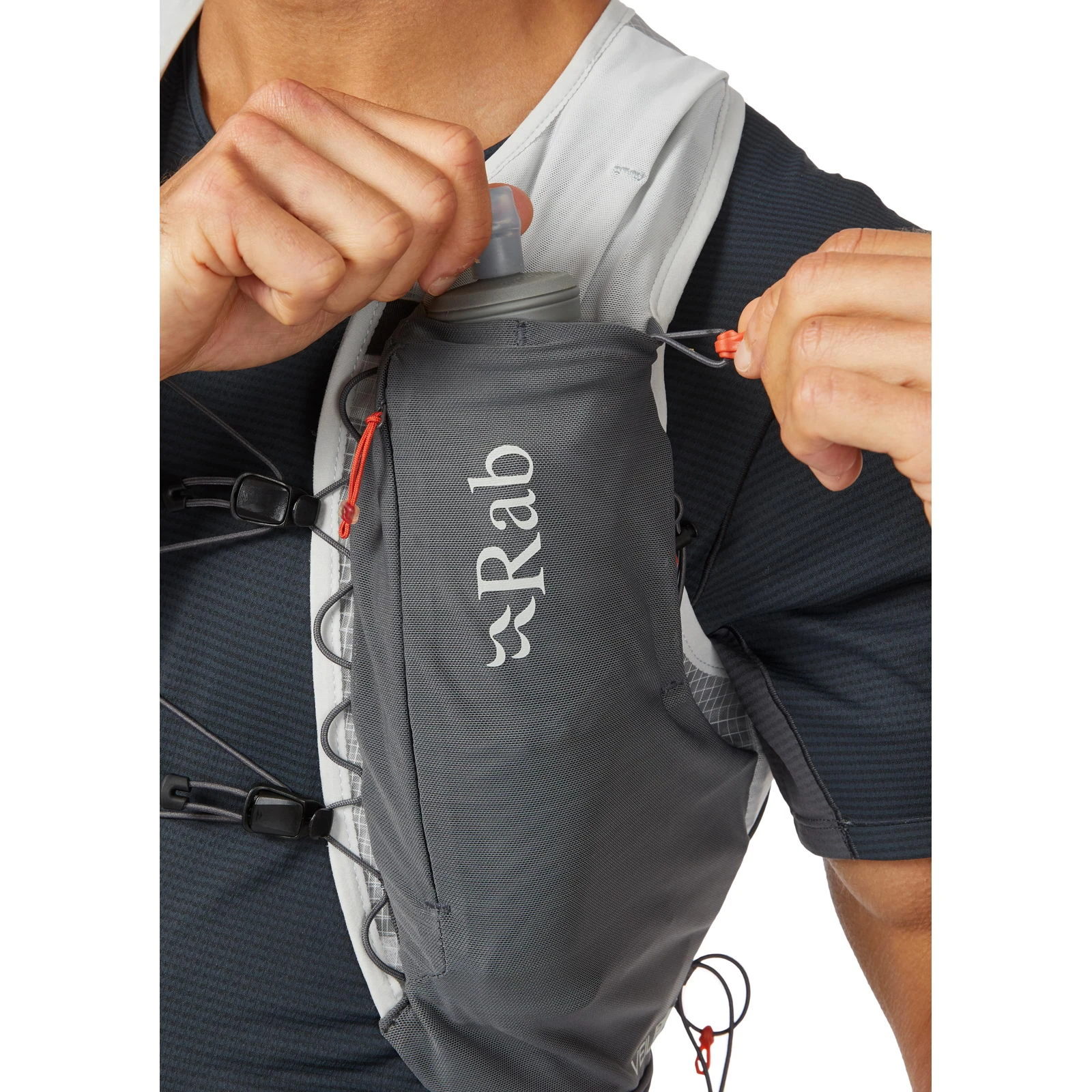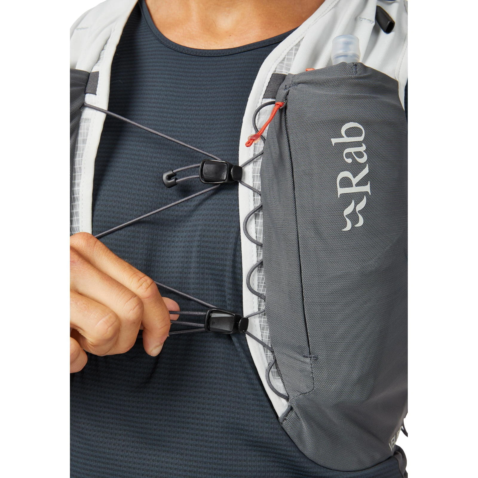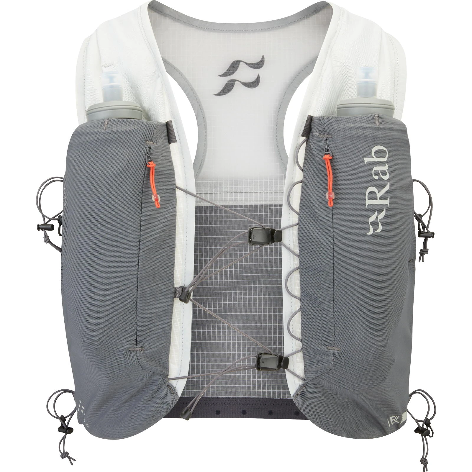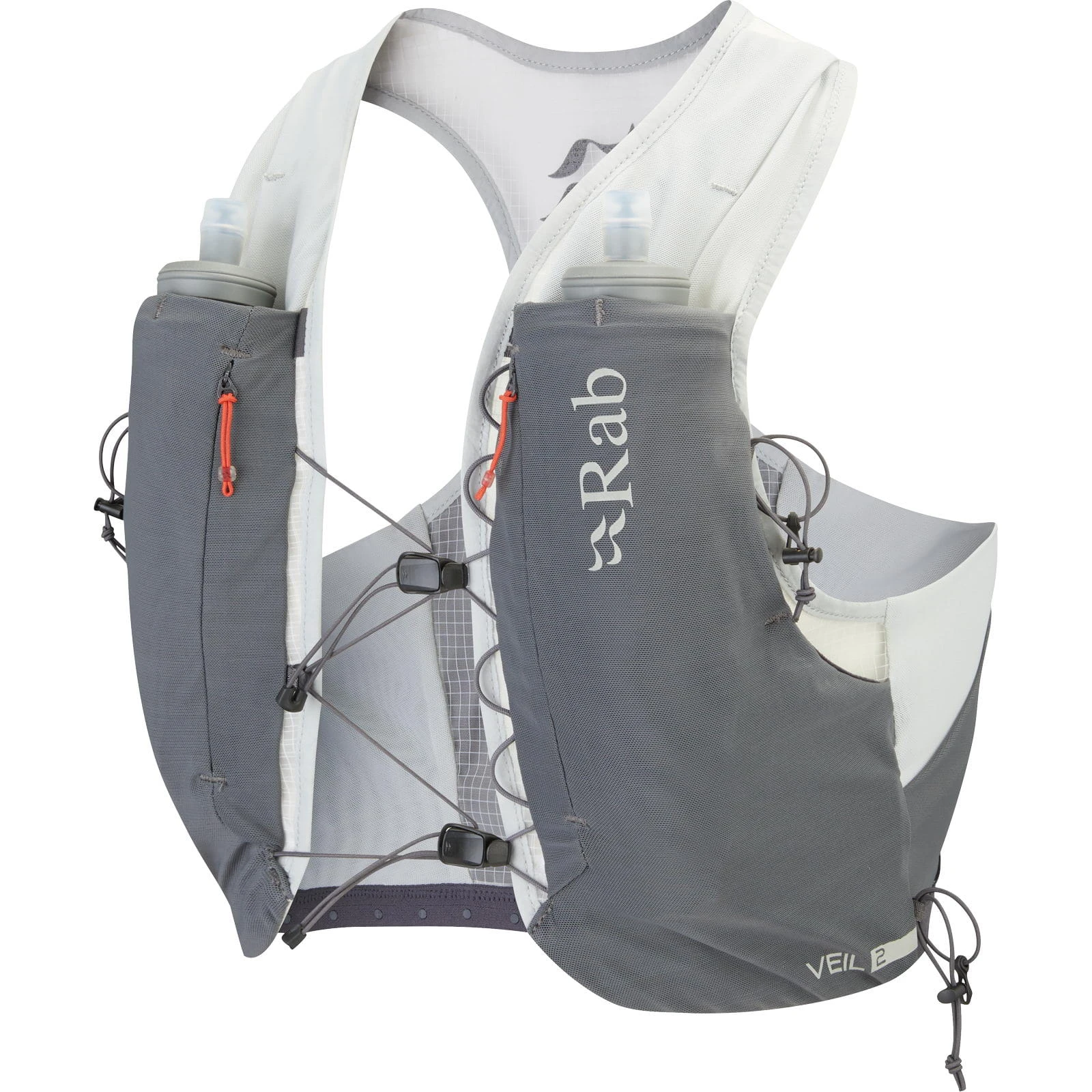 Die Veil 2 von Rab ist eine ultraleichte Laufweste mit zwei Trinkflaschen, die sich perfekt für schnelle Bergläufe eignet. Das Mono Mesh-Gewebe, das 50% leichter ist und 70% weniger Flüssigkeit aufnimmt als alternative Spacer-Mesh-Gewebe, bildet den Kern der Weste und sorgt dafür, dass sich keine Feuchtigkeit ansammelt und der Körper kühl und leicht bleibt, während man sich frei und unbeschwert über Hänge und Bergkämme bewegt. Die figurbetonte, stützende Veil 2 verfügt über ein verstellbares Brustbeinsystem und Stretcheinsätze an den Seiten, die die Passform verbessern und das Abfedern auf unebenem Gelände minimieren. Die beiden elastischen Brustgurte lassen sich an mehreren Befestigungspunkten einstellen. Die Trailrunningweste ist mit mehreren Taschen und Fächern ausgestattet und bietet ausreichend Stauraum für Trail-Snacks, zusätzliche Bekleidung und weitere Ausrüstungsgegenstände. Die Laufweste verfügt über ein großes Einschubfach am Rücken und mehrere kleine Einschubfächer auf den Schulterträgern, darunter auch zwei geräumige Taschen zum Verstauen der mitgelieferten komprimierbaren Trinkflaschen. Im Lieferumfang enthalten sind zwei 500 ml Falt-Trinkflaschen, um beim Laufen bequem trinken zu können. Selbst für Stöcke ist Platz, denn die Weste verfügt über Bungee-Halterungen an den Seiten. Die Veil 2 ist mit einer komplett fluorcarbonfreien DWR-Beschichtung imprägniert, superleicht und perfekt für Bergläufer, die auf jedes Gramm achten und bei ihren Abenteuern schnell vorankommen wollen.