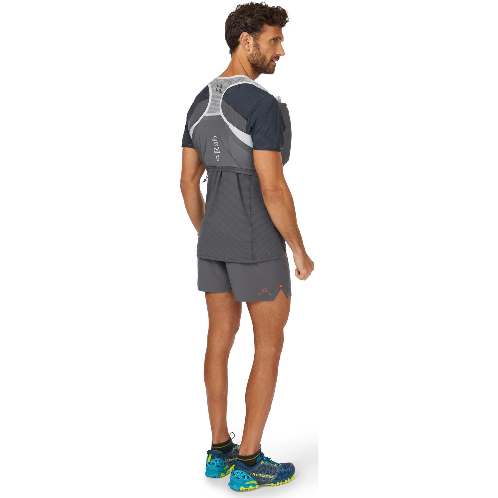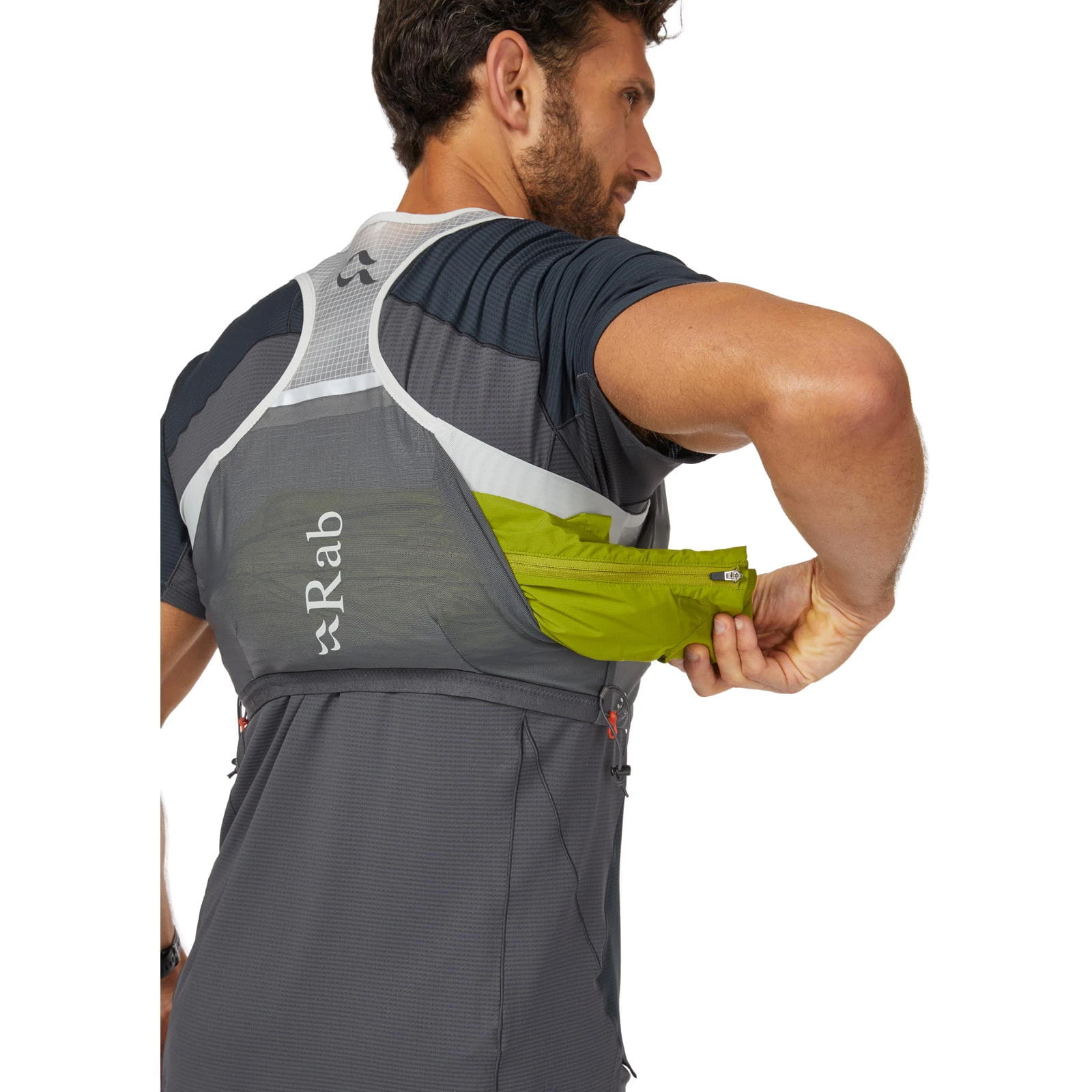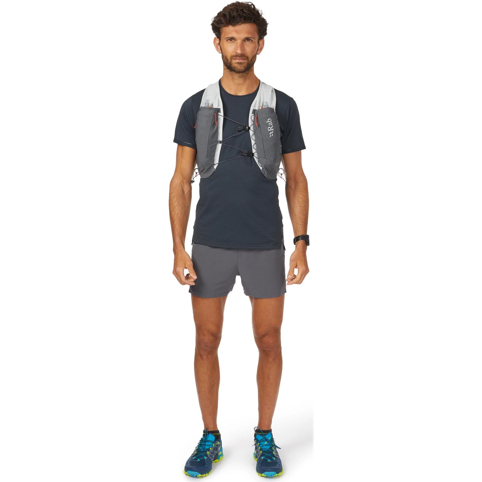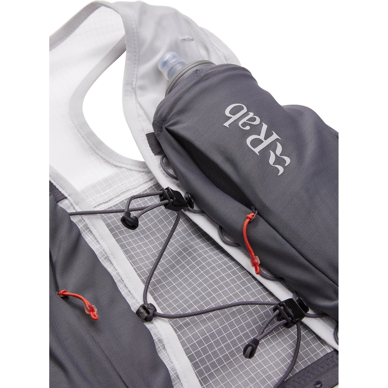 Die Veil 2 von Rab ist eine ultraleichte Laufweste mit zwei Trinkflaschen, die sich perfekt für schnelle Bergläufe eignet. Das Mono Mesh-Gewebe, das 50% leichter ist und 70% weniger Flüssigkeit aufnimmt als alternative Spacer-Mesh-Gewebe, bildet den Kern der Weste und sorgt dafür, dass sich keine Feuchtigkeit ansammelt und der Körper kühl und leicht bleibt, während man sich frei und unbeschwert über Hänge und Bergkämme bewegt. Die figurbetonte, stützende Veil 2 verfügt über ein verstellbares Brustbeinsystem und Stretcheinsätze an den Seiten, die die Passform verbessern und das Abfedern auf unebenem Gelände minimieren. Die beiden elastischen Brustgurte lassen sich an mehreren Befestigungspunkten einstellen. Die Trailrunningweste ist mit mehreren Taschen und Fächern ausgestattet und bietet ausreichend Stauraum für Trail-Snacks, zusätzliche Bekleidung und weitere Ausrüstungsgegenstände. Die Laufweste verfügt über ein großes Einschubfach am Rücken und mehrere kleine Einschubfächer auf den Schulterträgern, darunter auch zwei geräumige Taschen zum Verstauen der mitgelieferten komprimierbaren Trinkflaschen. Im Lieferumfang enthalten sind zwei 500 ml Falt-Trinkflaschen, um beim Laufen bequem trinken zu können. Selbst für Stöcke ist Platz, denn die Weste verfügt über Bungee-Halterungen an den Seiten. Die Veil 2 ist mit einer komplett fluorcarbonfreien DWR-Beschichtung imprägniert, superleicht und perfekt für Bergläufer, die auf jedes Gramm achten und bei ihren Abenteuern schnell vorankommen wollen.
