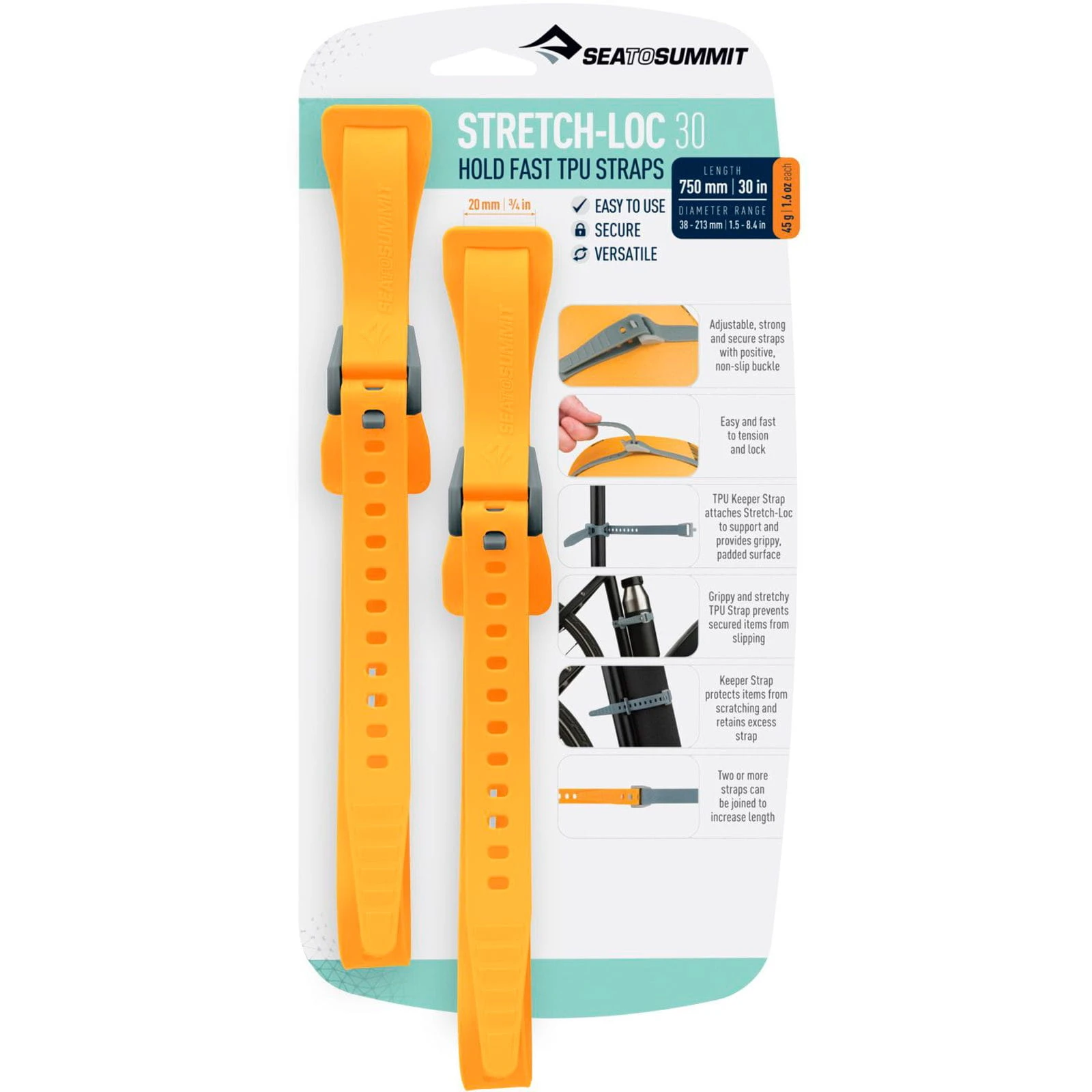 Ganz gleich, ob man seine Bikepacking-Ausrüstung am Rad oder die SUP-Paddel am Dach perfekt sichern will, die Stretch-Loc-Strap 30 (20 x 750 mm) von Sea to Summit sind ein integraler Bestandteil der Abenteuer-Vorbereitung. Für einen starken Halt einfach den superfesten TPU-Gurt um alles wickeln, was zu befestigen ist und ihn mit der Nylonschnalle simpel einrasten. Das überschüssige Band liegt dann flach an der Schlaufe an, so dass es bequem aus dem Weg ist.