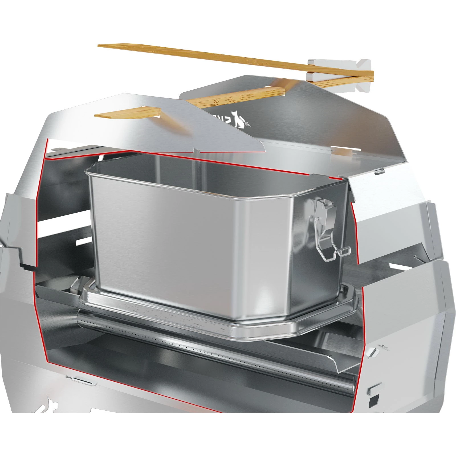 Die Cap von Skotti ist eine praktische Erweiterung für den Skotti Grill, sie dient als Deckel, Windschutz, Drehspießaufsatz, Toaster und vieles mehr, zusätzlich ist eine hochwertige Grillzange im Lieferumfang. Die Cap ist Multifunktional und erweitert den Grill unter anderem um eine Ofenfunktion (Pizza, Low and Slow) oder eine Toastfunktion. Die Cap ist leicht und kompakt und passt zusätzlich in die Skotti-Grilltasche, sie ist wie der Grill schnell und mit ein paar wenigen Handgriffen aufgebaut. Die Cap ist aus hochwertigem Edelstahl gefertigt, die praktische Grillzange mit Flaschenöffner besteht aus stabilem Bambusholz und Aluminium.