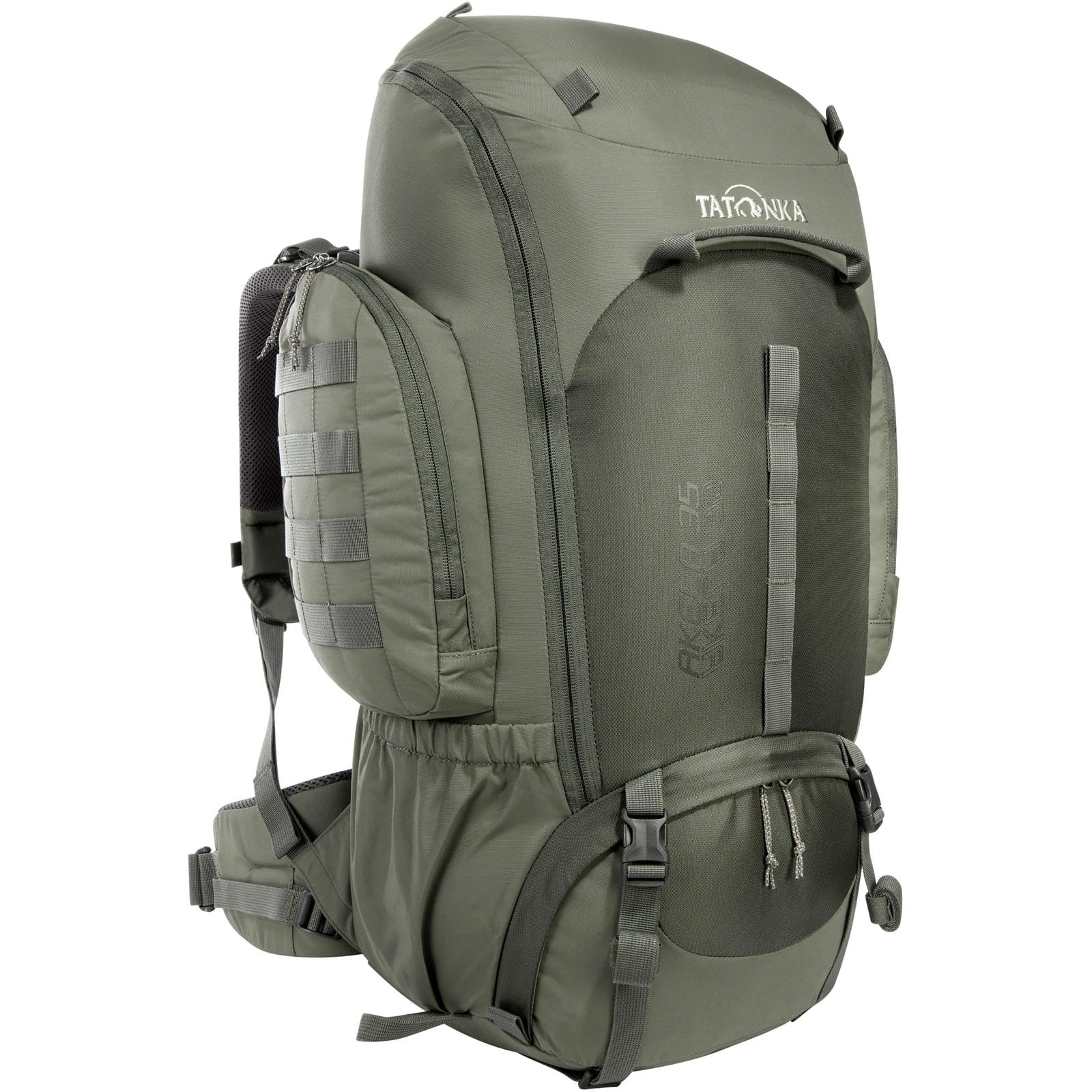 Der Akela 35 von Tatonka ist ein Trekkingrucksack für Jugendliche und Trekking-Einsteiger und eignet sich hervorragend für Pfadfindertouren, Kurzreisen oder Zeltlager. Sein angenehm flexibles V Comfort Vario-Tragesystem sorgt für eine effiziente Lastübertragung im Hüftbereich und damit für rückenschonendes Tragen. Hüftgurt, komfortabel gepolsterte Schulterträger und Lastkontrollriemen können individuell eingestellt werden. Das V Comfort Vario-Tragesystem lässt sich zudem an unterschiedliche Rückenlängen anpassen und kann so in gewissem Maße „mitwachsen“. Der Akela 35 verfügt über ein vollständig aufklappbares Hauptfach für eine übersichtliche Beladung und ein separates, von außen zugängliches Bodenfach. Das Bodenfach dient traditionell der Unterbringung des Schlafsacks oder schmutziger Kleidung. Der Tourenrucksack ist unter anderem mit einer Trinksystemvorbereitung, einer Stockhalterung und einer kleinen Reißverschlusstasche im Inneren für Wertsachen ausgestattet. Zusätzlich verfügt der Trekking-Rucksack seitlich über zwei elastische Einschubfächer und zwei große, aufgesetzte Seitentaschen mit Reißverschluss, hinter denen ein offener Einschubkanal z.B. für Zeltgestänge genutzt werden kann. Materialschlaufen an Deckel, Front und Seitentaschen sowie die umlaufende Bodenkompression bieten weitere Befestigungsmöglichkeiten und runden den Teenager-Trekkingrucksack ab.