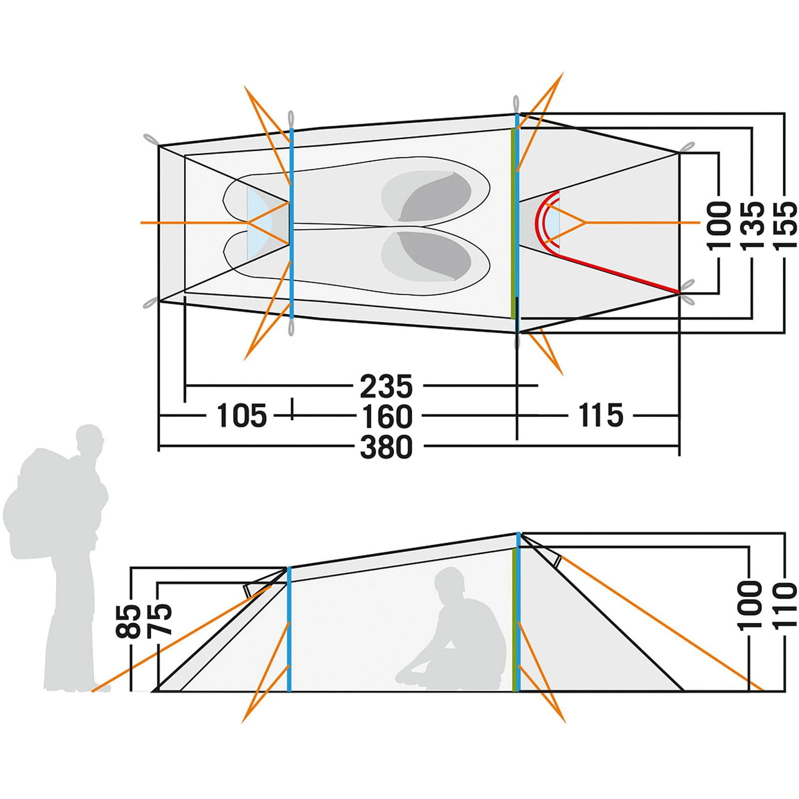 Das 2-Personen-Zelt Gargia 2 von Tatonka bietet im Verhältnis zum Gewicht ein außergewöhnlich gutes Platzangebot: Mit einer Liegelänge von 2,35 m finden auch großgewachsene Menschen bequem Platz. Das extraleichte, silikoniserte Außenzeltmaterial (5-fach silikonbeschichtetes Ripstop-Nylon 6.6 mit der Faserstärke 20 Denier) und leichte Nylon-Materialien für Boden und Innenzelt sorgen für eine perfekte Balance von niedrigem Gesamtgewicht und großer Robustheit für einen breiten Einsatzbereich. Das Zeltbodenmaterial ist PU-beschichtet und schützt mit einer Wassersäule von 10.000 mm optimal vor Nässe von unten. Das 2-Personen-Zelt besitzt einen Frontzugang mit einer Apsis für das Gepäck. Ein zusätzlicher Reißverschluss-Zugang auf der gegenüberliegenden Schmalseite und Lüfter sorgen für optimale Belüftungs- und Trocknungsmöglichkeiten. Innen- und Außenzelt sind gekoppelt und können gemeinsam aufgestellt werden. Bei Regen kann das Innenzelt beim Abbau aber auch ausgehängt und trocken verstaut werden. Beim nächsten Aufbau wird dann zuerst das Außenzelt errichtet und anschließend das trockene Innenzelt eingehängt.