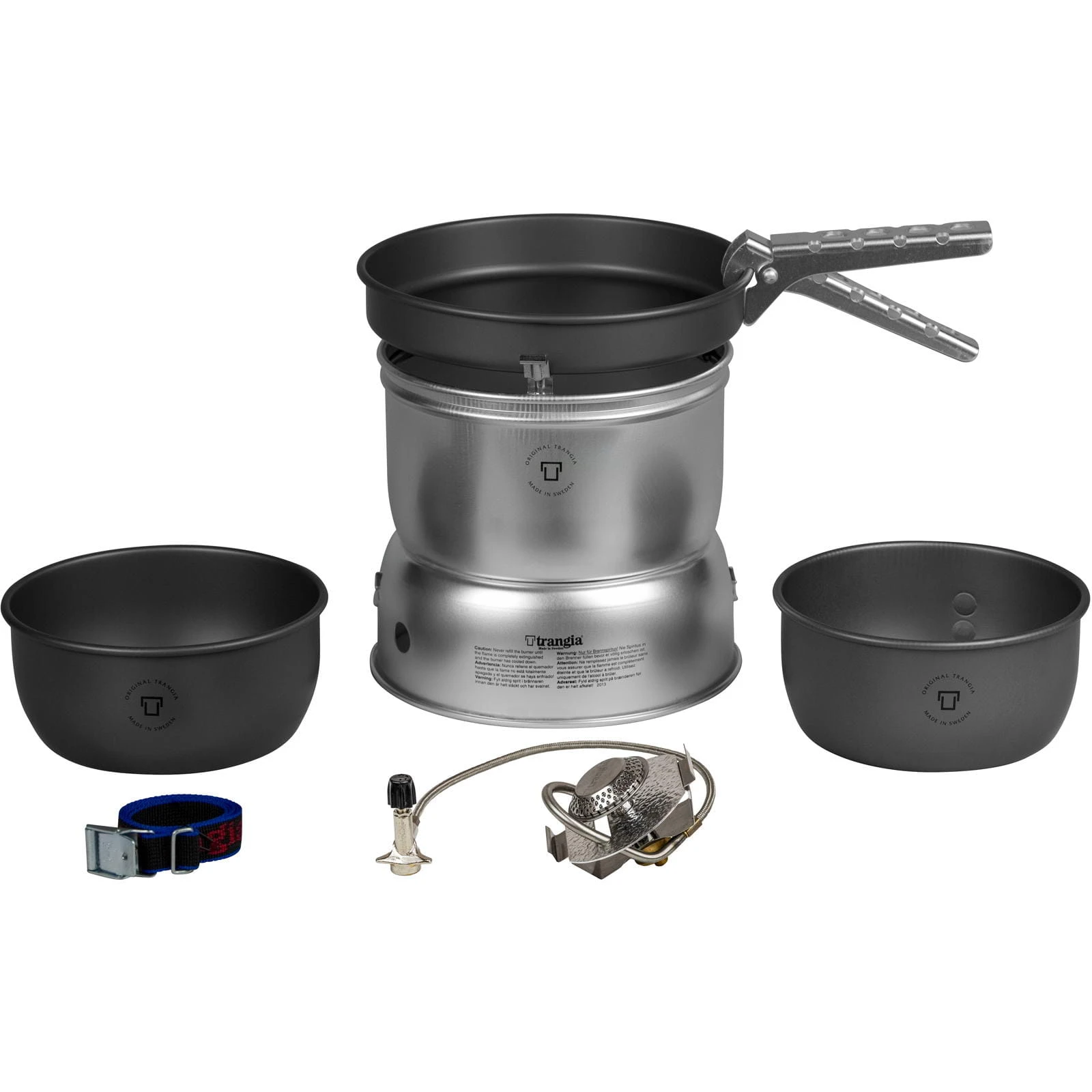 Ausstattung: 1 x Topf 1,0 Liter mit Maßeinteilung (HA Aluminium), 1 x Topf 1,0 Liter ohne Maßeinteilung (HA Aluminium), 1 x Bratpfanne 18 cm Durchmesser (HA Aluminium), oberer Windschutz (UL Aluminium), unterer Windschutz (UL Aluminium), Gas Brenner, Zange, Riemen