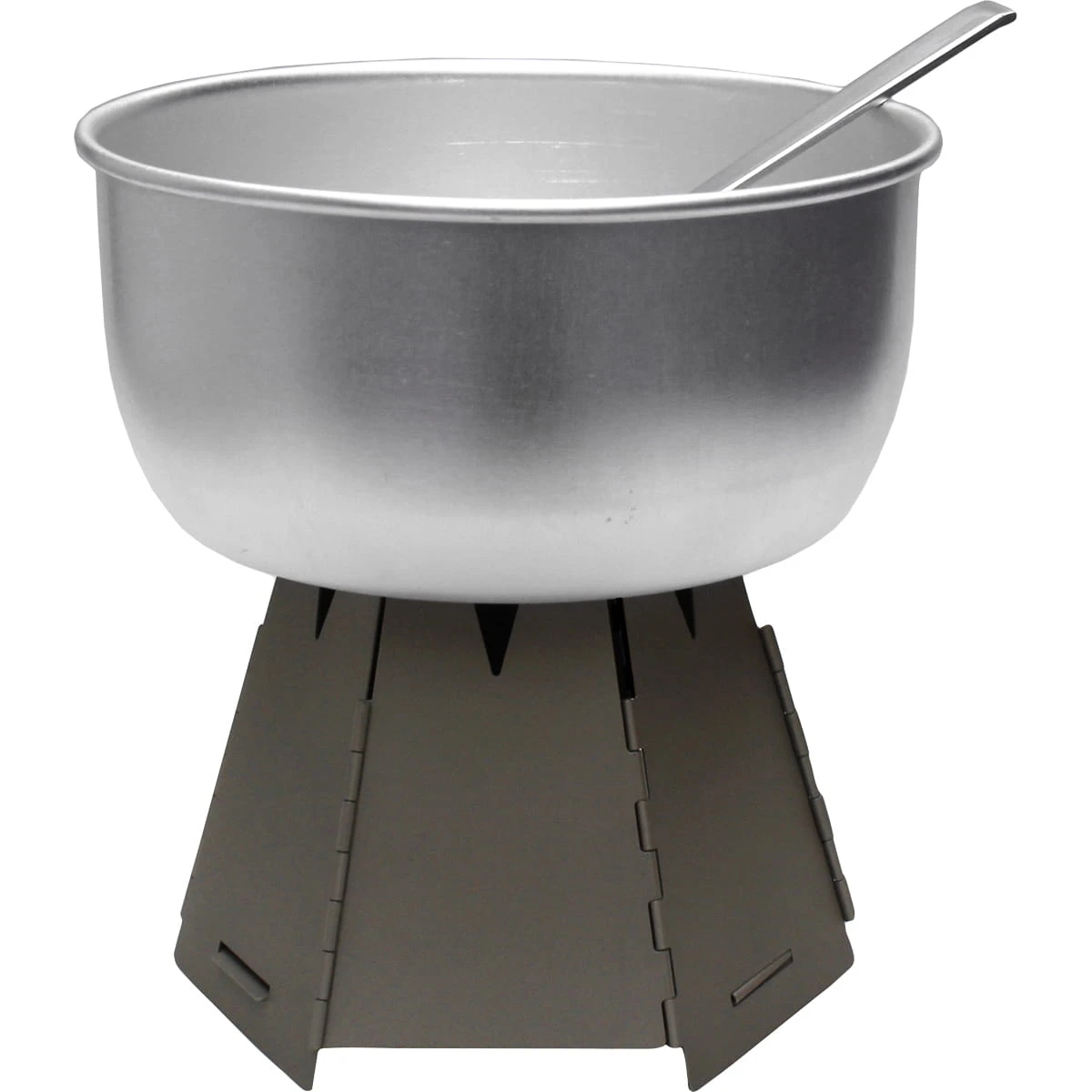 Der ultimative Mini Outdoor-Ofen. Kommt extrem flach gefaltet mit unschlagbarem Packmaß aus. Dann aber entfaltet er seine ganze ‘Größe’: Die Bauteile sind schnell zusammengeklappt und halten auch große Hitze aus. Einheizen mit kleinen Holzstücken, Moos oder anderem Brennmaterial. Natürlich passt auch ein Spirituskocher (z.B. Vargo Decagon) oder ein Esbitkocher in den Hexagon. Dann fungiert dieser quasi als Windschutz. Einen Topf (otimal bis maximal 1,4 L) dann einfach oben auf den Ofen stellen. Durch die konische Form zieht der Ofen sehr gut und die Front-‘Tür’ erlaubt ein gezieltes Nachlegen bzw. eine Regulierung der Luftzufuhr um die Brennleistung zu erhöhen.