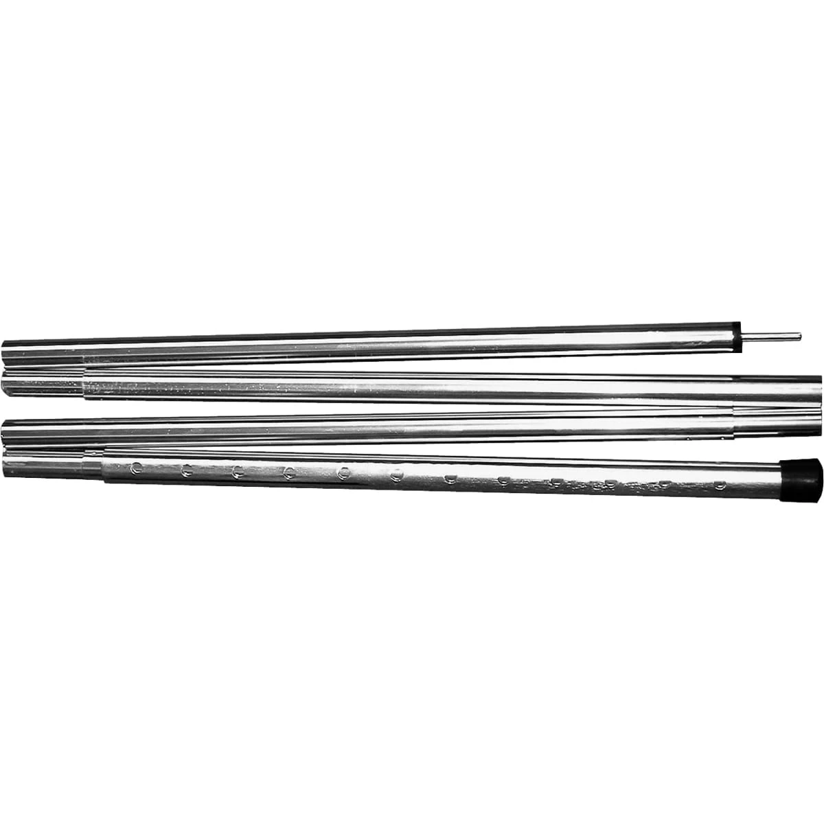 Leichte Aufstellstange für Tarps, Planen und Vorzelte. Mit Klemmverschlüssen (ähnlich wie vom Bergstock bekannt). Vier Elemente (19 mm Außendurchmesser) sind fix mittels Gummizug verbunden. Das fünfte Element hat zwölf mögliche Verstellpunkte (im Abstand von ca. 3,2 cm) und kann die Tarp-Stange somit in einer Länge von 183 cm bis 218 cm Länge justieren. Auseinander genommen kommt die Aufstell-Stange auf ein Maß von 50 x 5,5 cm und bringt lediglich 486 g auf die Waage.