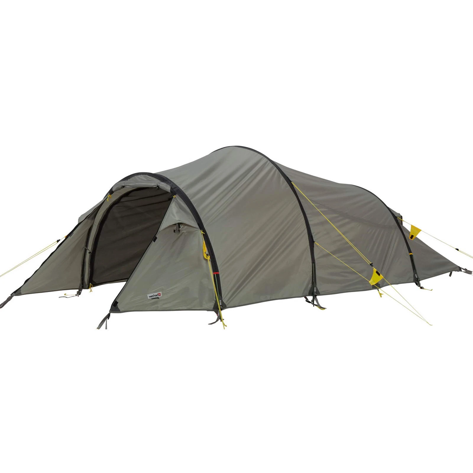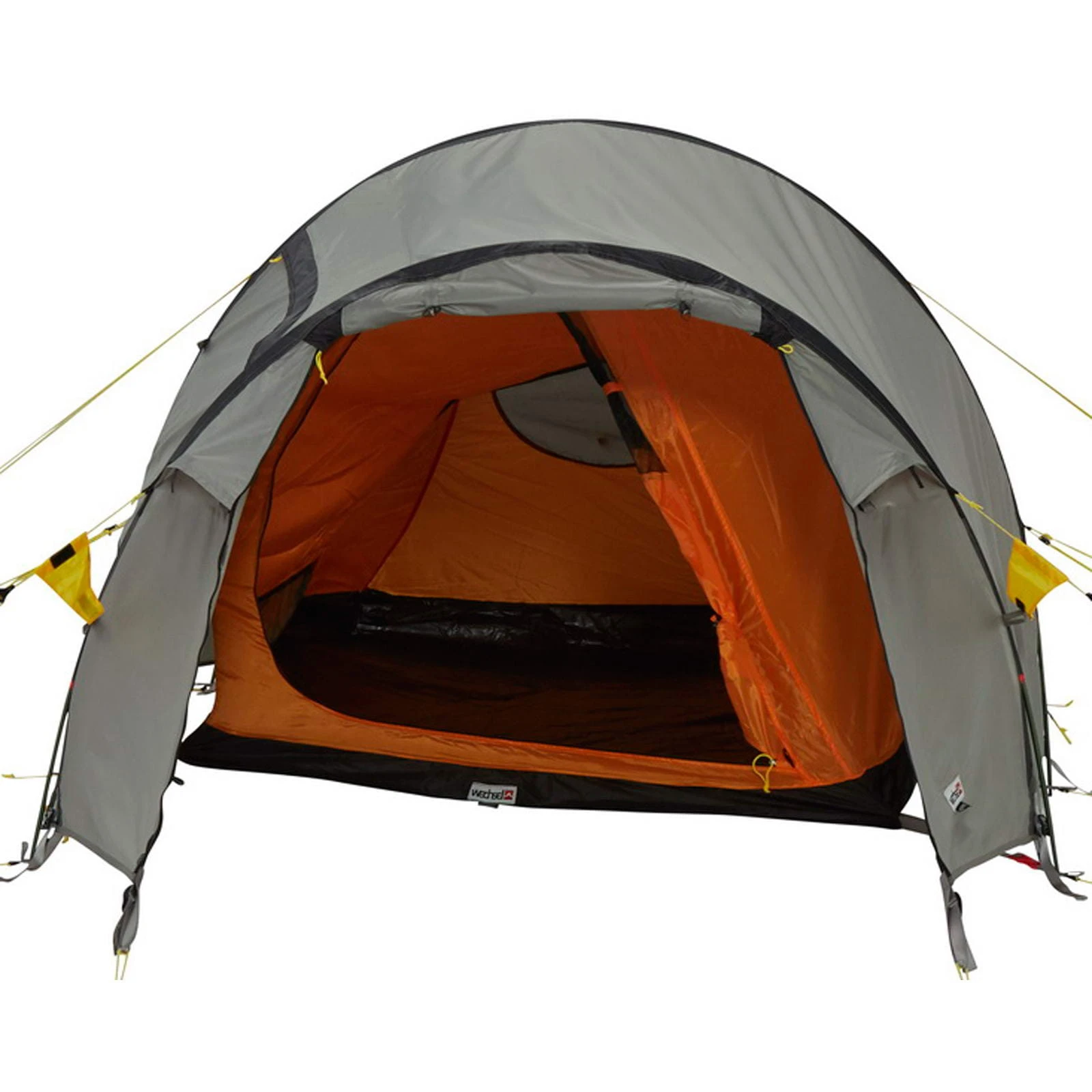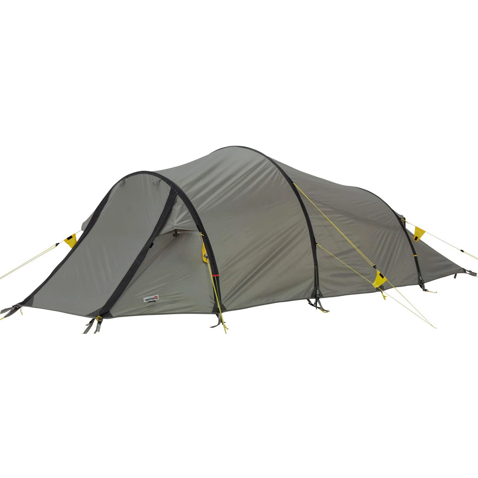 In seiner Art unverwechselbar: Eines der erfolgreichsten Modelle von Wechsel Tents: das Outpost 2 ist seit Beginn an im Zelt Programm von Wechsel. Sehr geräumig für 2 Personen. Der einzigartige Innenzeltschnitt bietet auch einer sehr großen Person einen komfortablen Schlafplatz. Es bietet die Vorteile einer asymmetrischen Tunnelzeltform wie z.B. relativ geringes Gewicht und hohe Sturmstabilität bei großer Apsis und geräumigem Innenzelt. Es hat einen regengeschützten, abdeckbaren Moskitogaze-Innenzelteingang in D-Form und eine große Apsis mit zwei Eingängen. Die großflächige Dachlüftung der Apsis, die sich vom vorderen bis zum mittleren Gestängebogen erstreckt, verbessert deutlich die Belüftung. Um die Abdeckung dieser Fläche zu realisieren, wurde das Zelt mit effizient zu handhabenden außen liegenden Gestängekanälen versehen. Das Innenzelt bietet viel Platz für zwei Personen und ist mit einer rückwärtigen Ventilation und vielen Taschen versehen. Der seitliche Eingang und ein vorderer Eingang machen das Handling mit Gepäck einfach. Bei aufgerolltem vorderen Eingang bietet sich ein hervorragender Panoramablick aus dem Zelt. Im Vergleich zum Modell bis 2018 verzichtet Wechsel Tents auf die Dachlüftung im Apsisbereich.